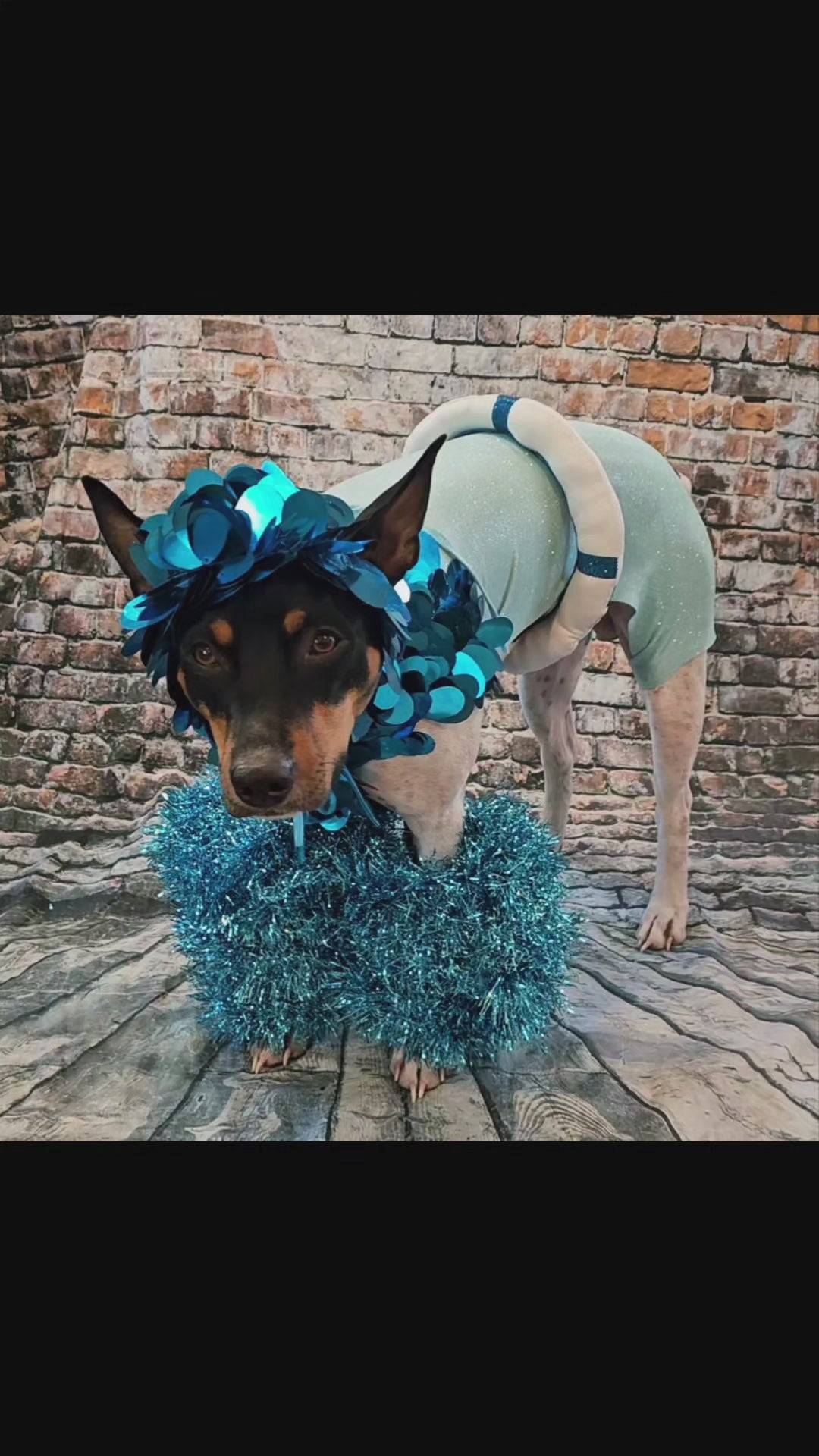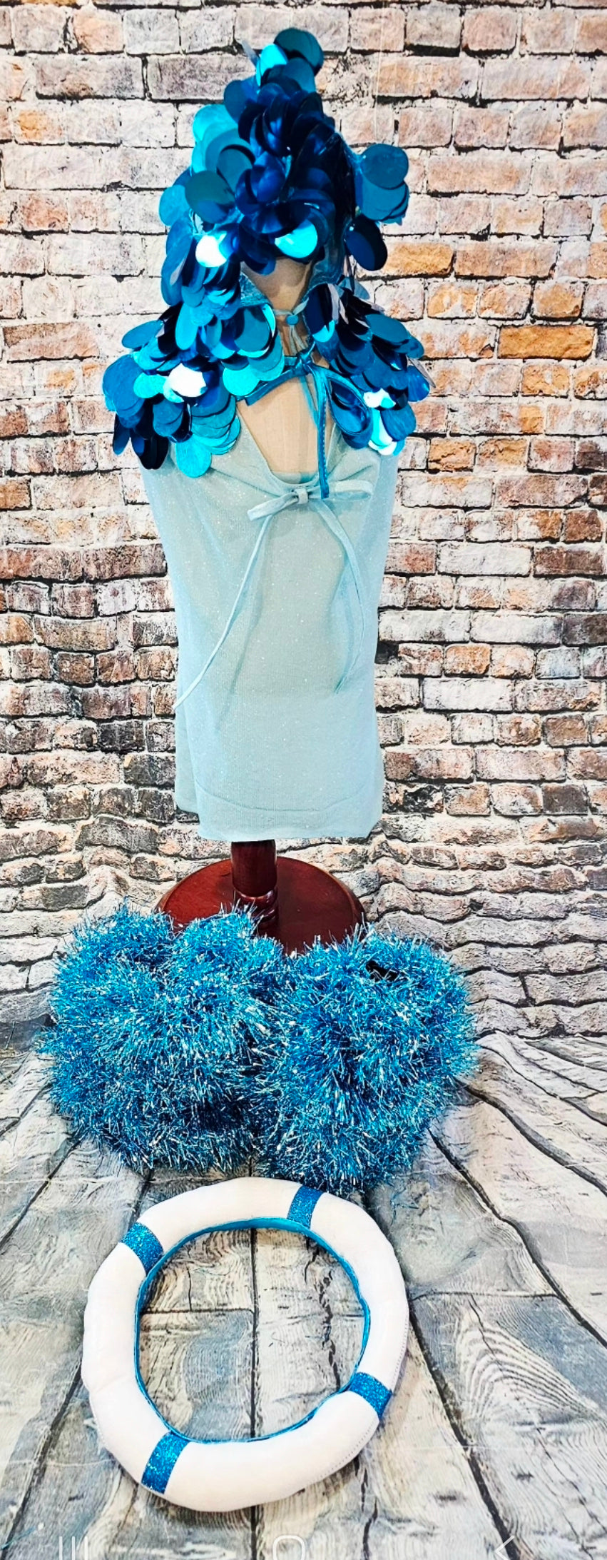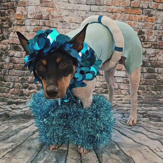 Inspired by Taylor Swift's iconic music video Fate of Ophelia aesthetic, this exclusive pet costume captures the essence of glamorous aquatic style. Crafted from shimmering light blue metallic lurex fabric, the swimsuit features eye-catching sequin embellishments and a custom-fitted sequin swimmer design with ear cutouts for comfortable wear. Adjustable straps ensure a secure fit for your furry friend, while coordinating blue foil fringe armbands and a decorative life saver ring complete the look. A truly one-of-a-kind piece for fans who want their pets to shine just as brightly.