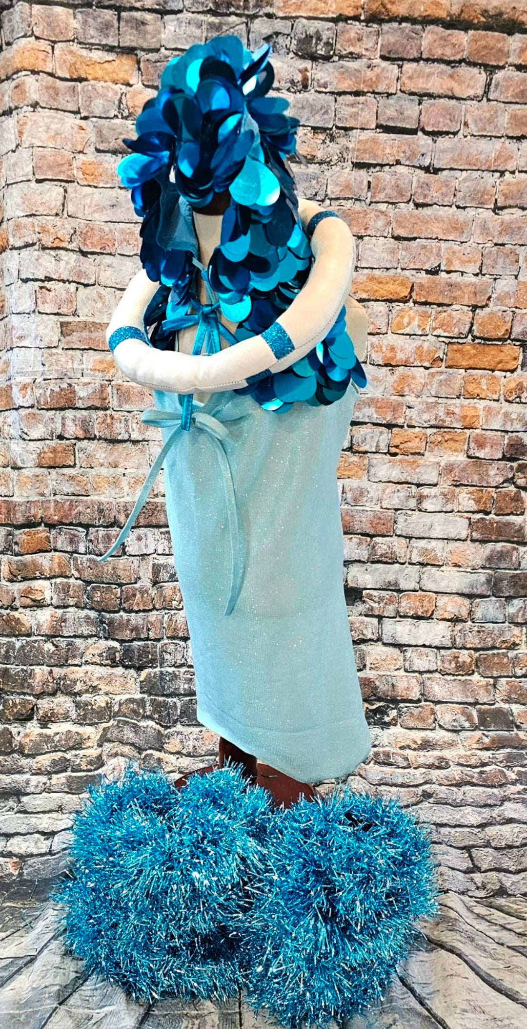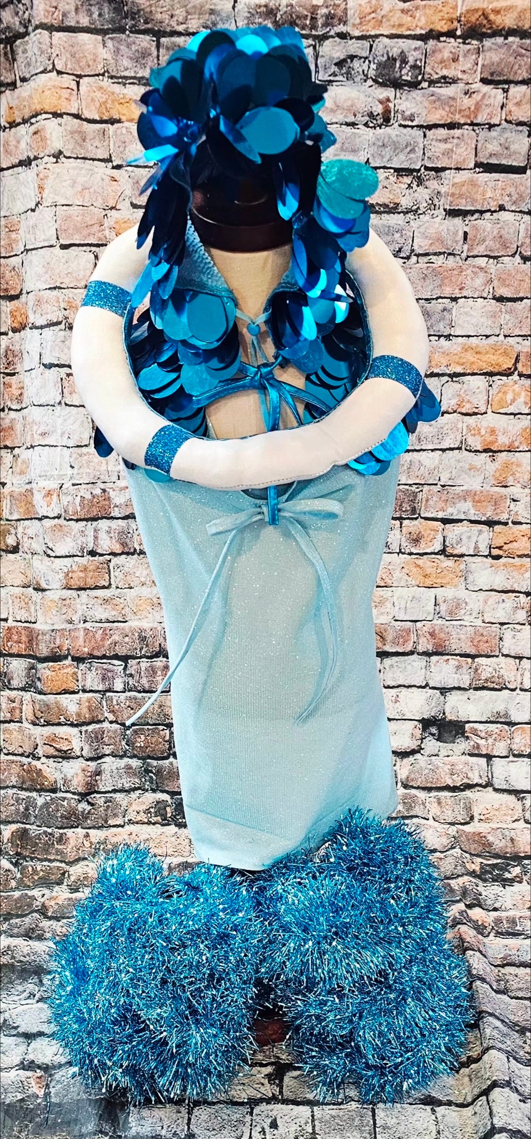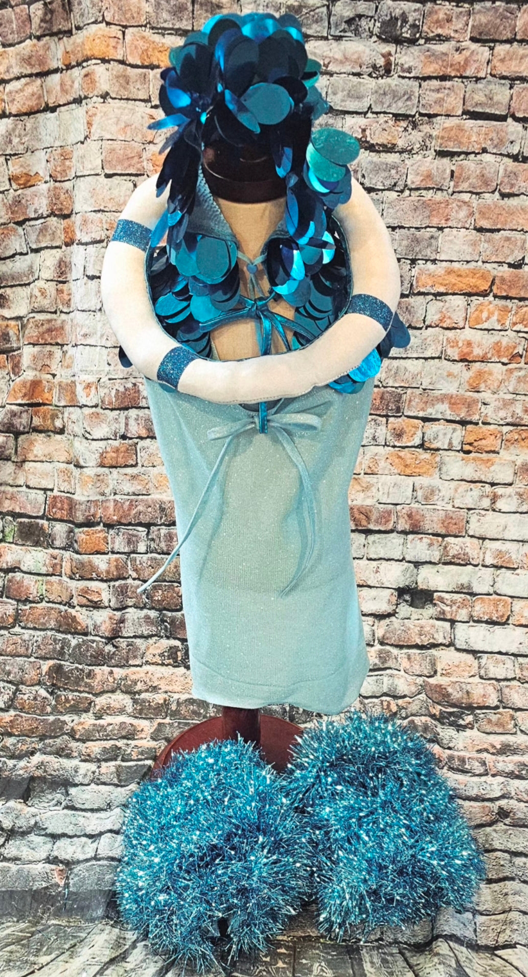 Inspired by Taylor Swift's iconic music video Fate of Ophelia aesthetic, this exclusive pet costume captures the essence of glamorous aquatic style. Crafted from shimmering light blue metallic lurex fabric, the swimsuit features eye-catching sequin embellishments and a custom-fitted sequin swimmer design with ear cutouts for comfortable wear. Adjustable straps ensure a secure fit for your furry friend, while coordinating blue foil fringe armbands and a decorative life saver ring complete the look. A truly one-of-a-kind piece for fans who want their pets to shine just as brightly.