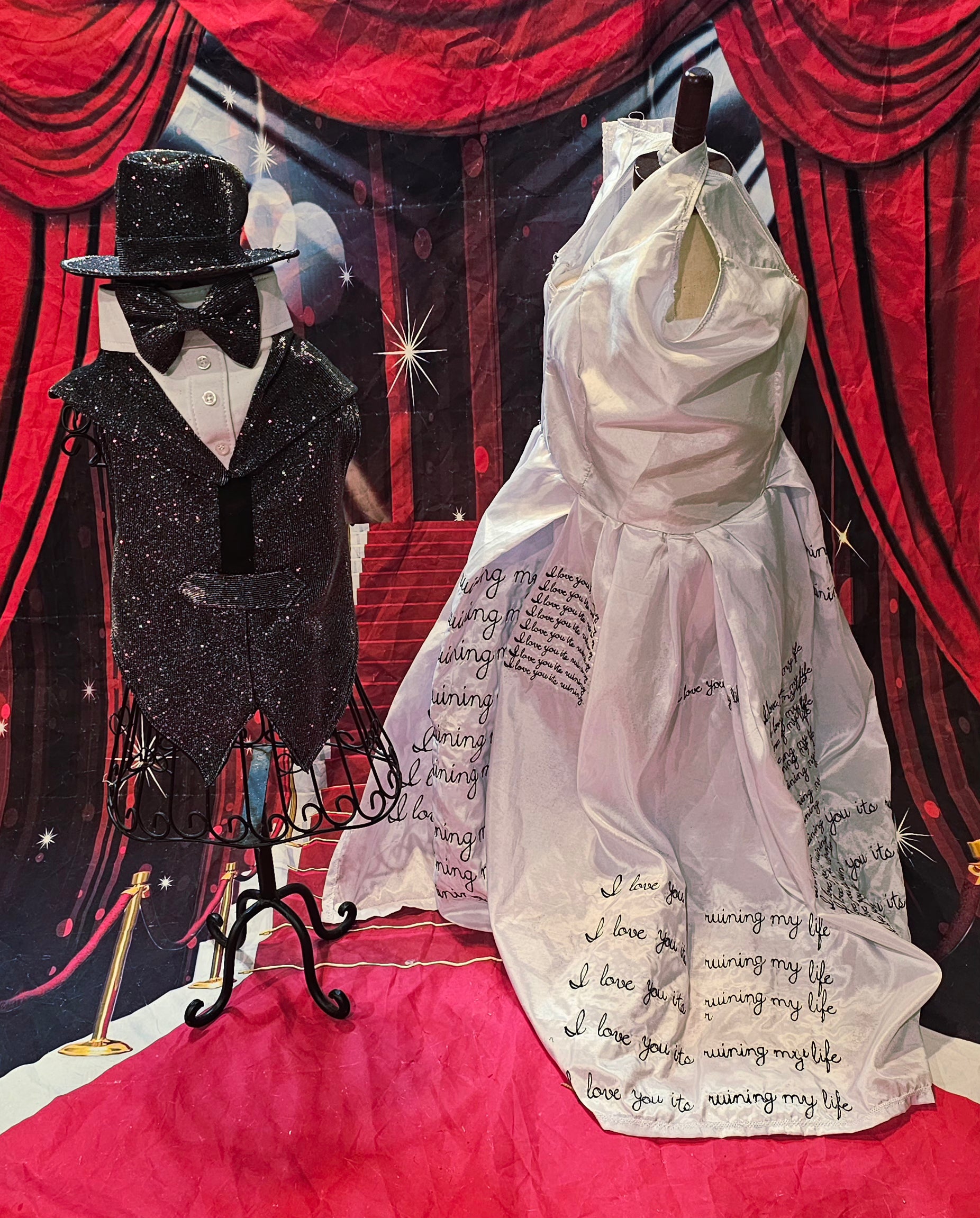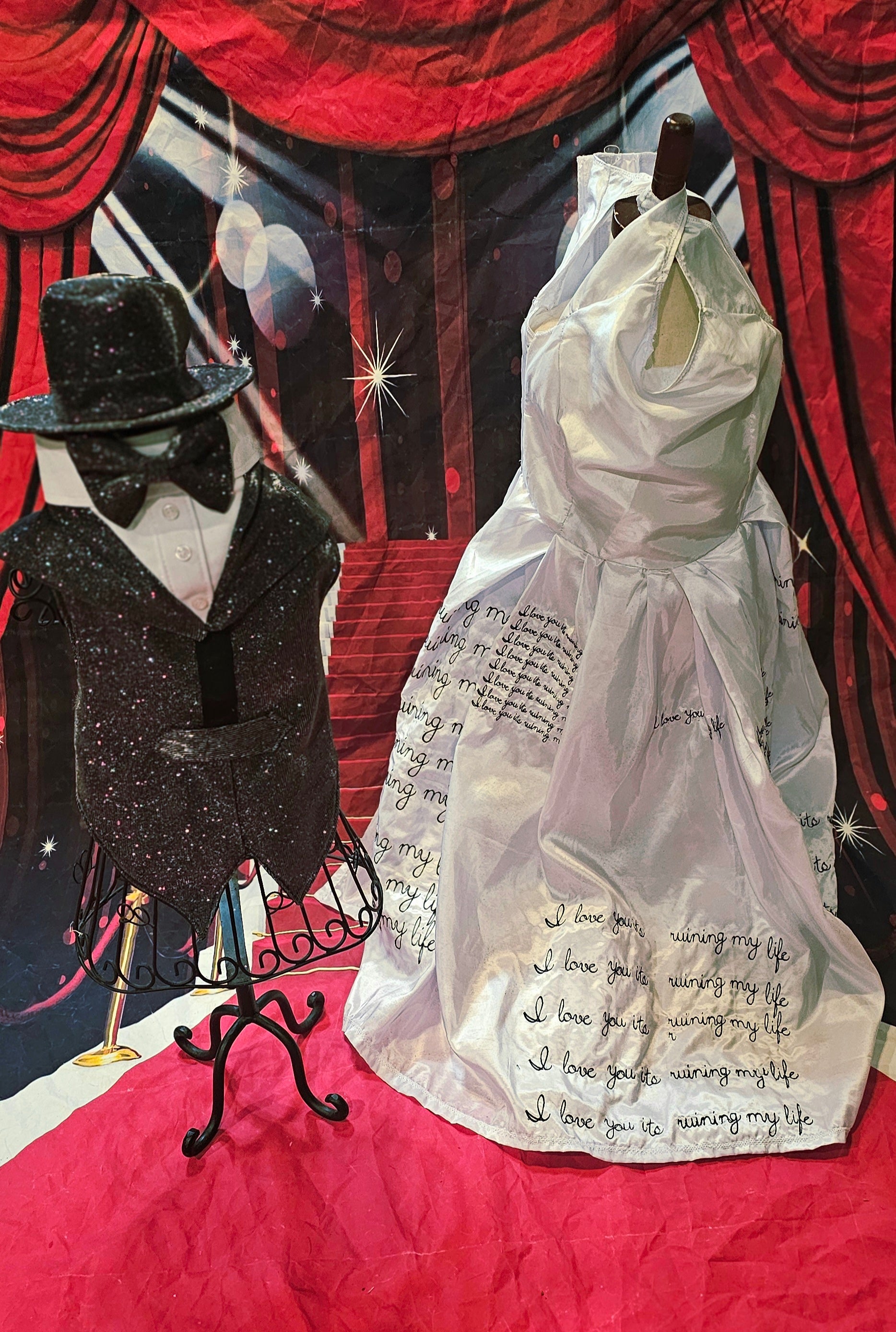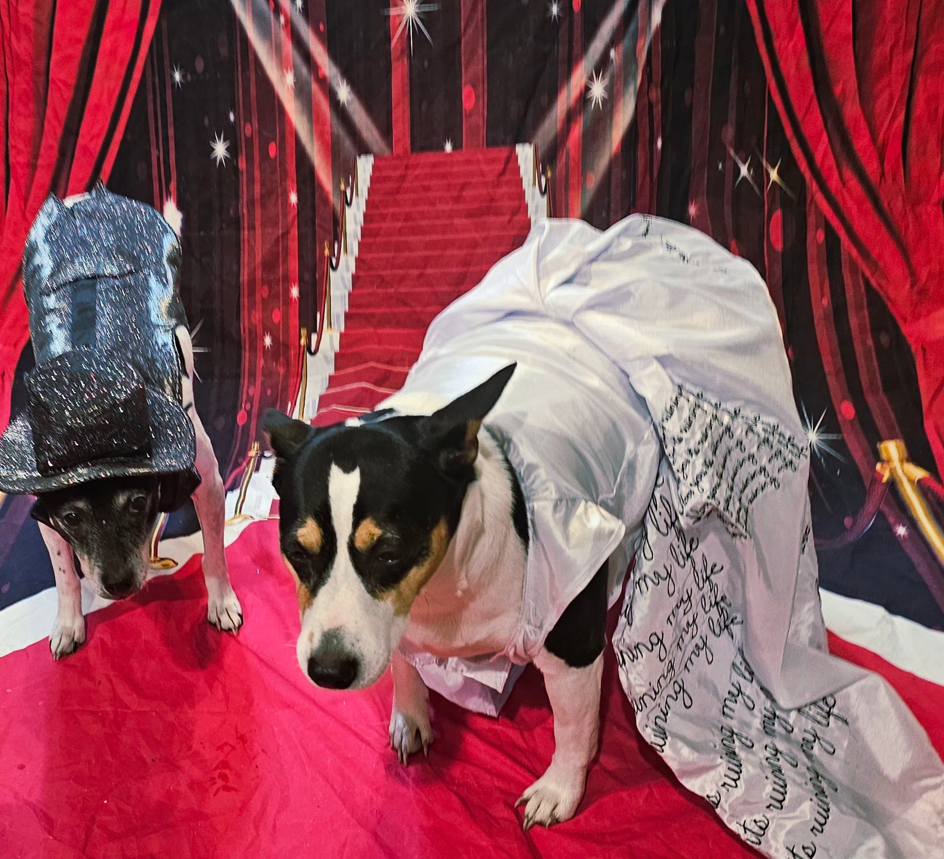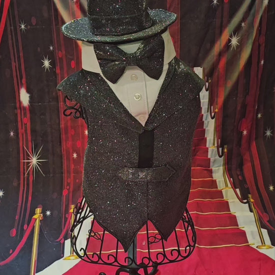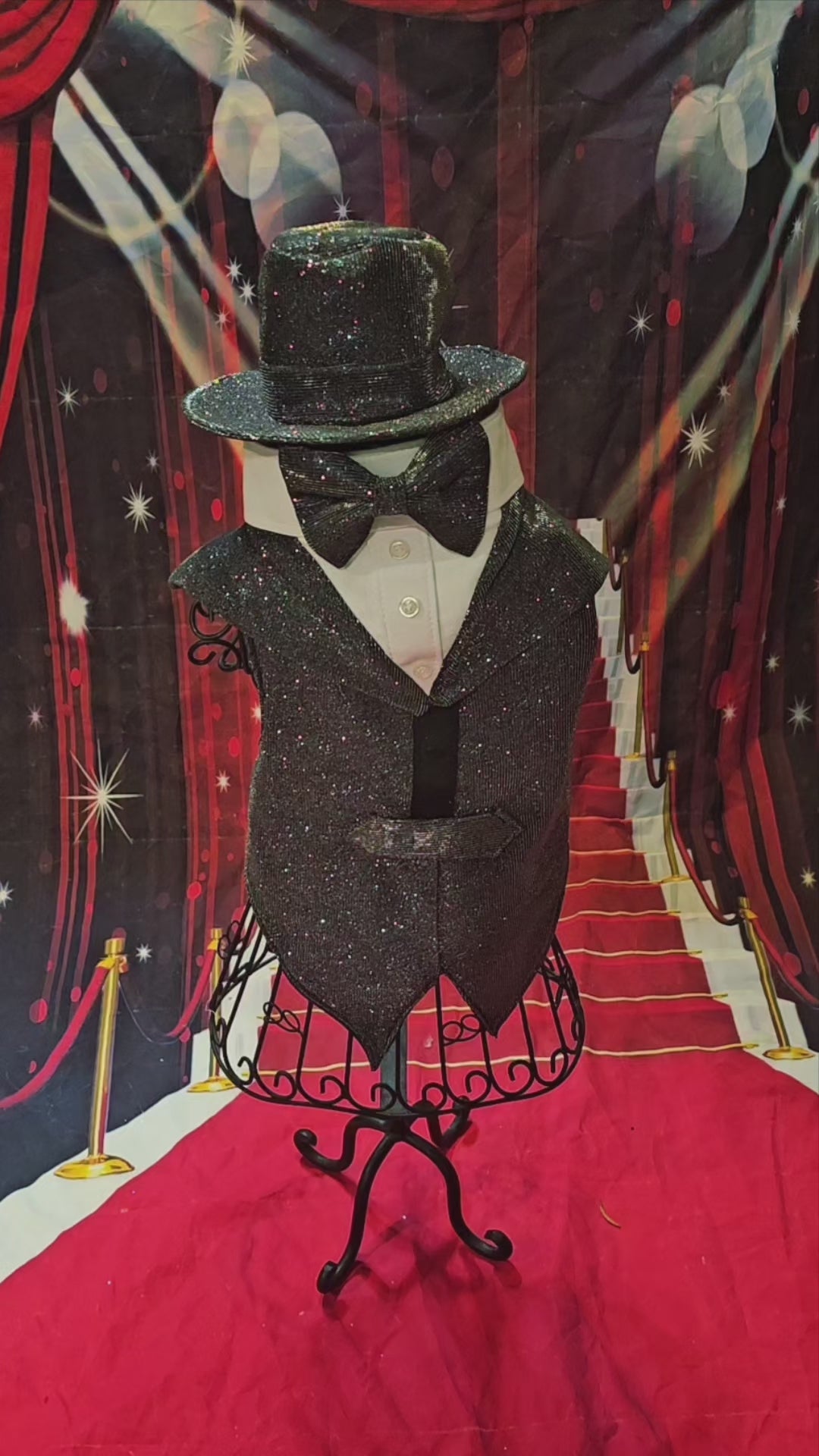 Glitter pet tux and top hat. Great for costumes, weddings, and parties. Not your typical pet tux. We add a little sparkle to ours. Made with glitter lurex metallic fabric. Pick from variety color chooses. Choose between bow-tie or long tie. Comes with top hat.