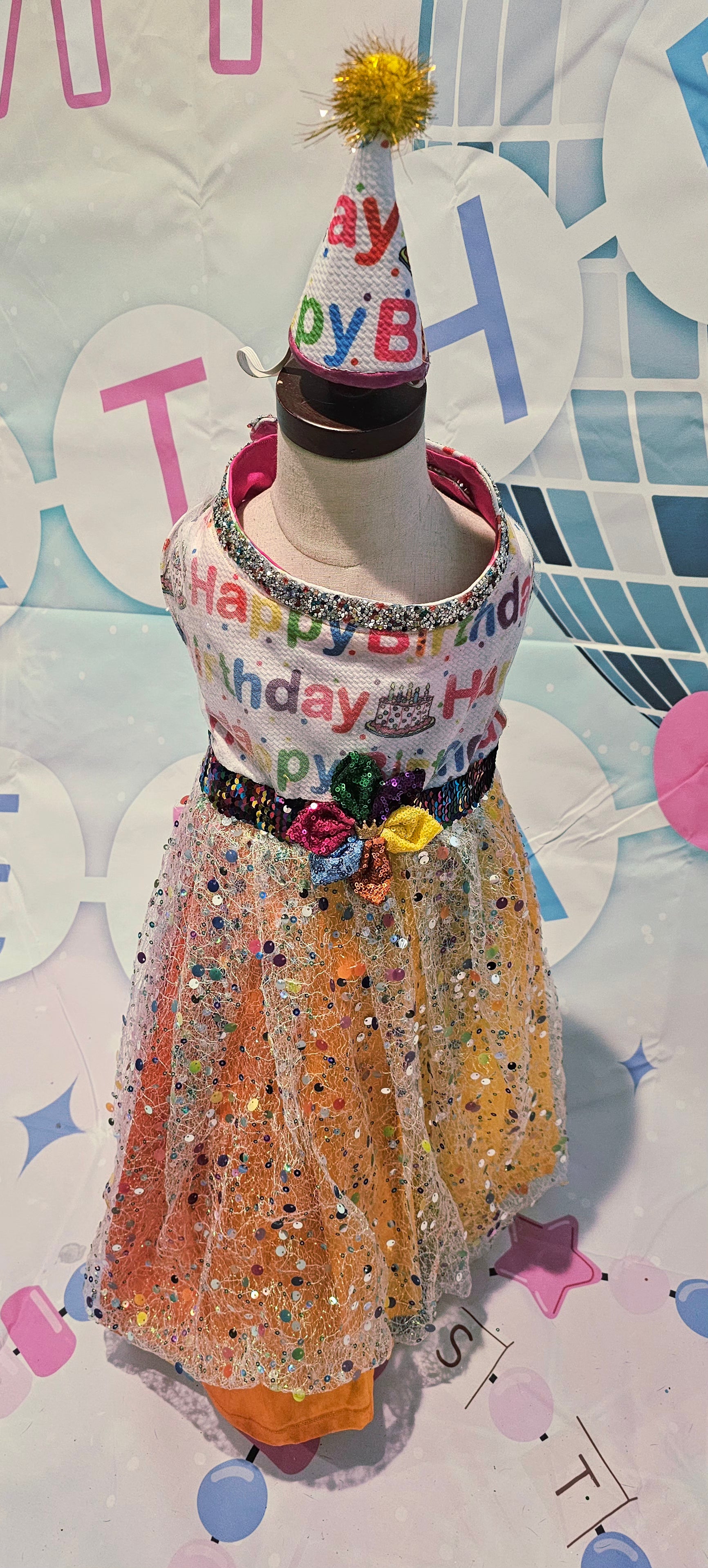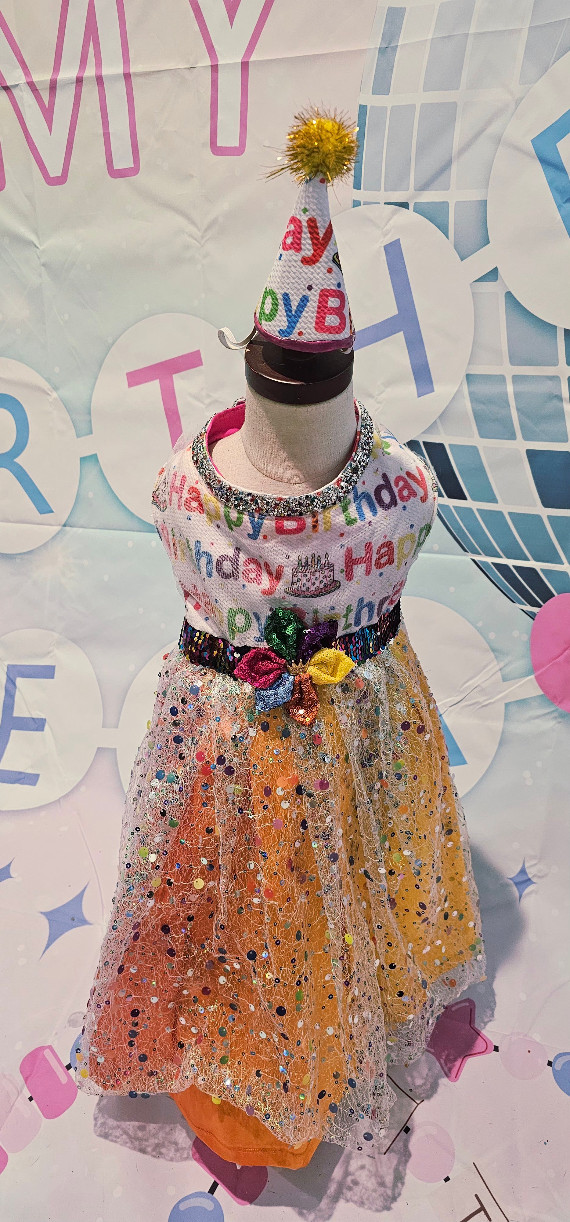 Happy Birthday pattern bullet textured liverpool fabric 4 way stretch spandex knit fabric. Ombre satin skirt with mesh confetti tulle overlay. Rainbow sequin trim, fushia flower rhinestone trim. Add same print Birthday hat with strap or light up fedora for additional charge.