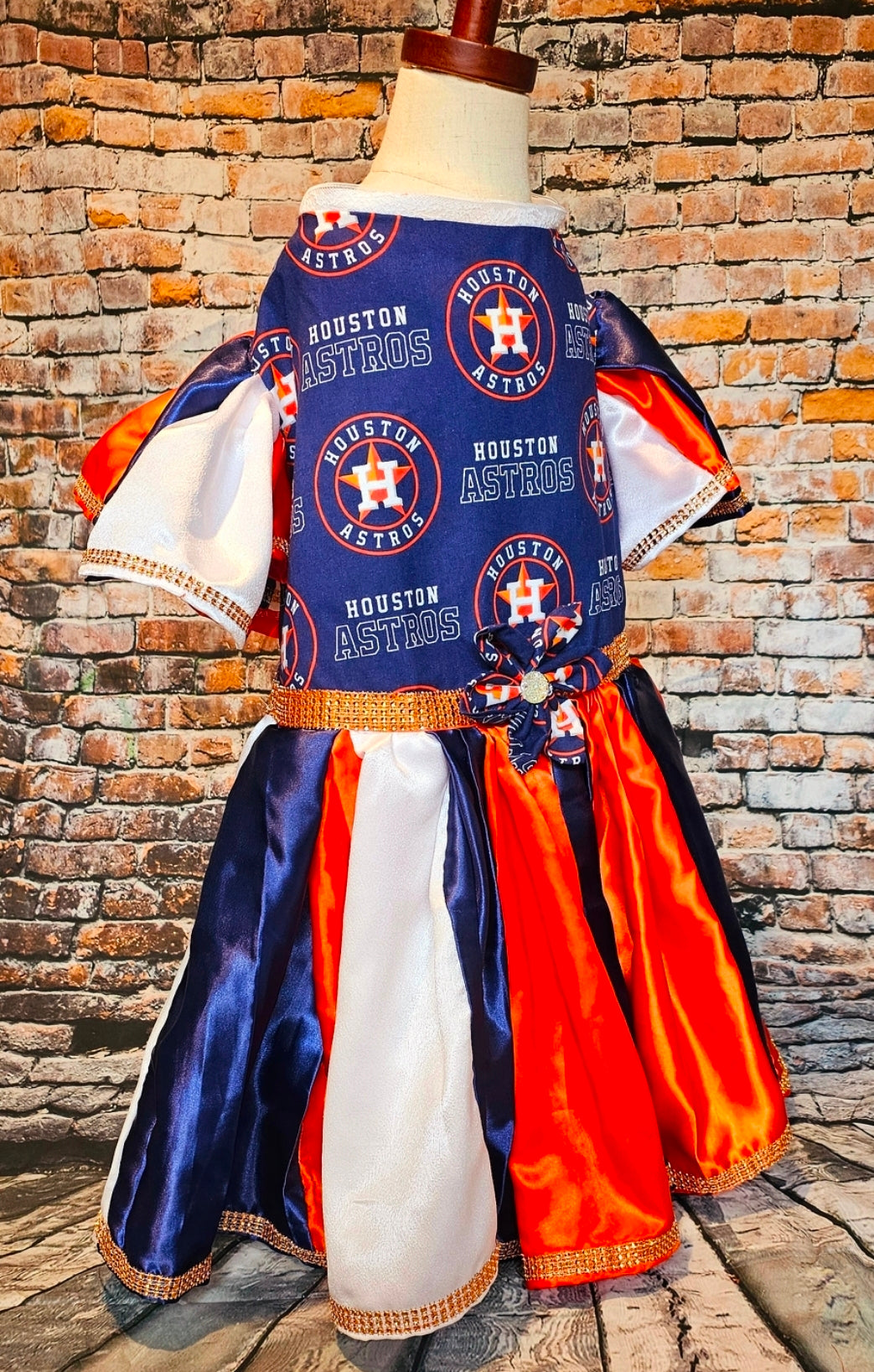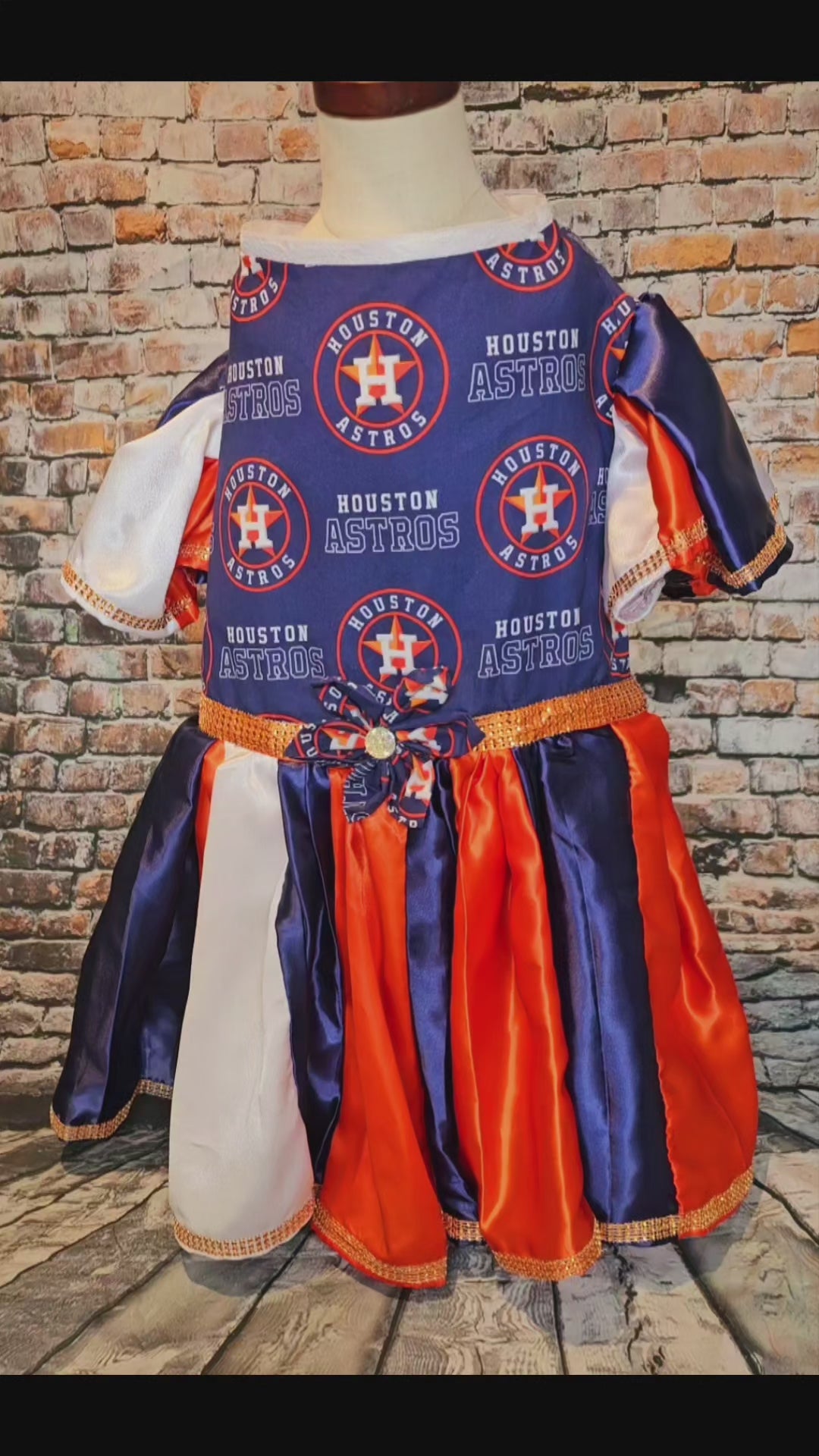 Transform your furry fan into a true Astros supporter with this custom-crafted pet dress. Featuring an authentic cotton print bodice showcasing team colors, the design pairs seamlessly with an elegant satin skirt in vibrant orange and navy accents. Delicate rhinestone embellishments add a touch of glamour while celebrating Houston baseball pride. Perfect for game day outings, photo opportunities, or showing off team spirit in style.