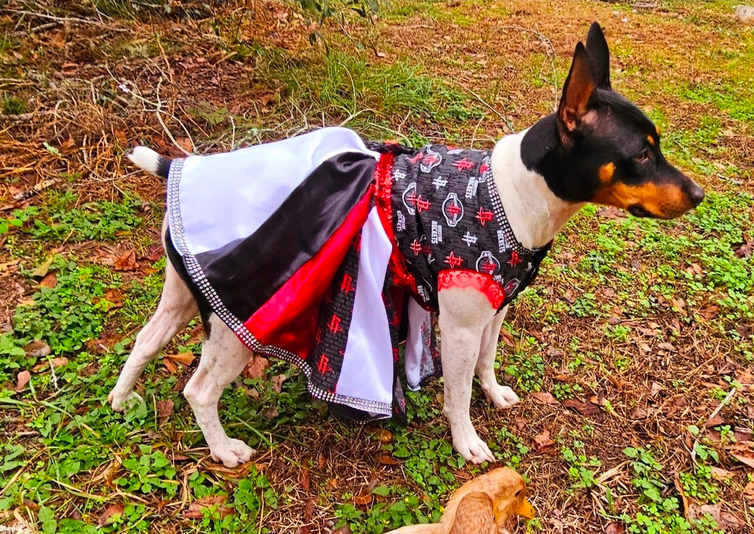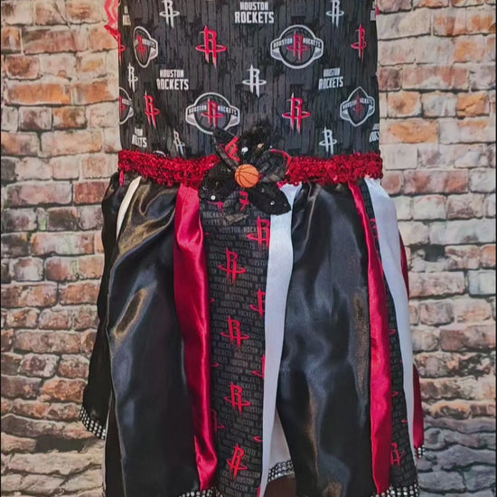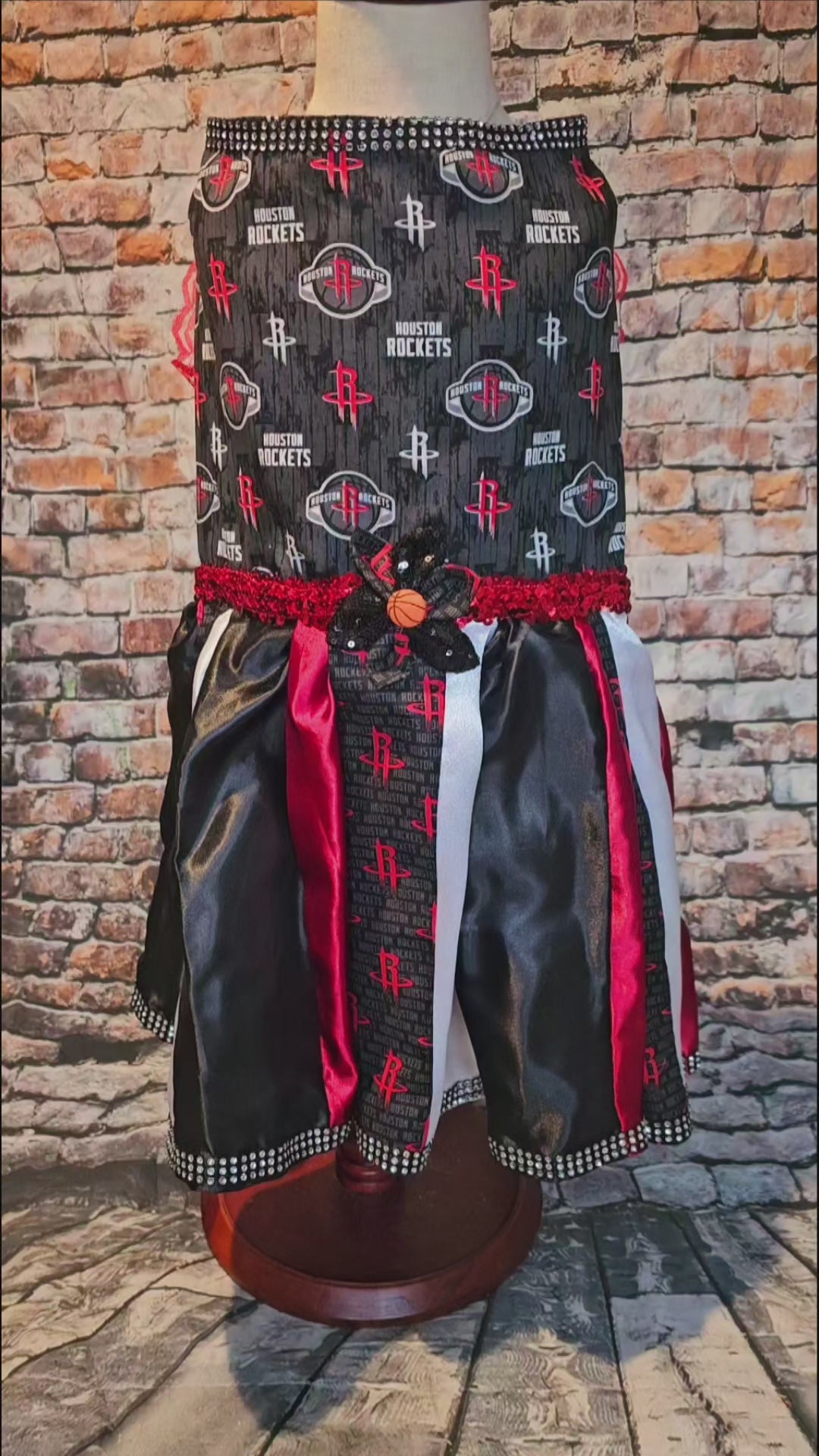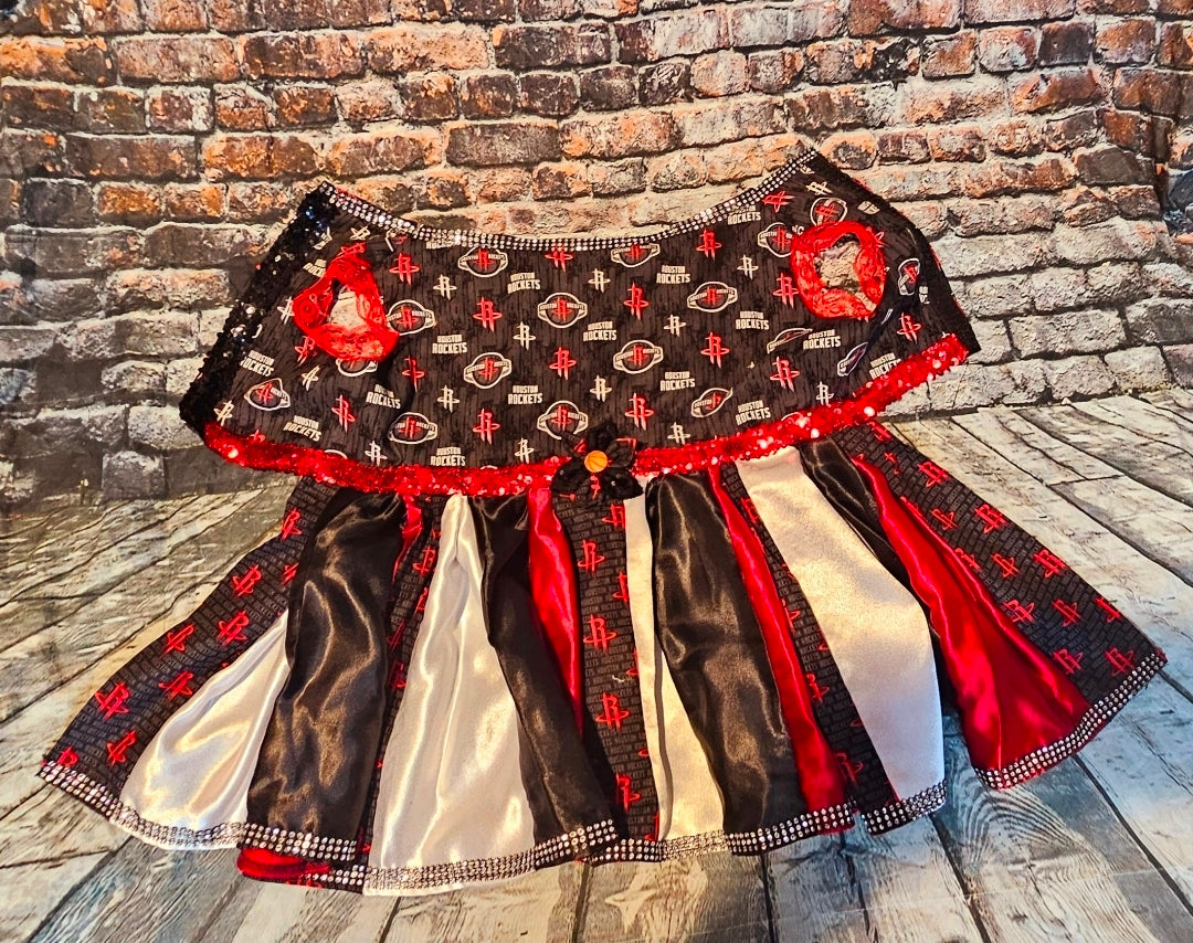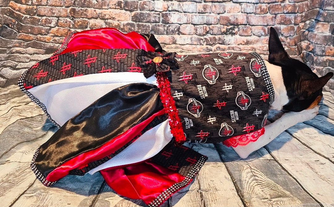 Let your pet celebrate their team spirit with this custom Houston Rockets dress. Crafted from premium cotton featuring official Rockets fabric, this made-to-order piece combines style with comfort. The design showcases a coordinating satin skirt in team colors with Rockets print, accented by rhinestone and lace trim for added elegance. Velcro closures on the front bodice ensure easy dressing. Select from two distinctive Rockets fabric options to personalize your pet's look.