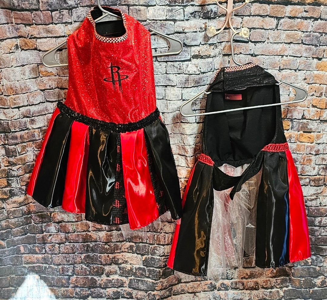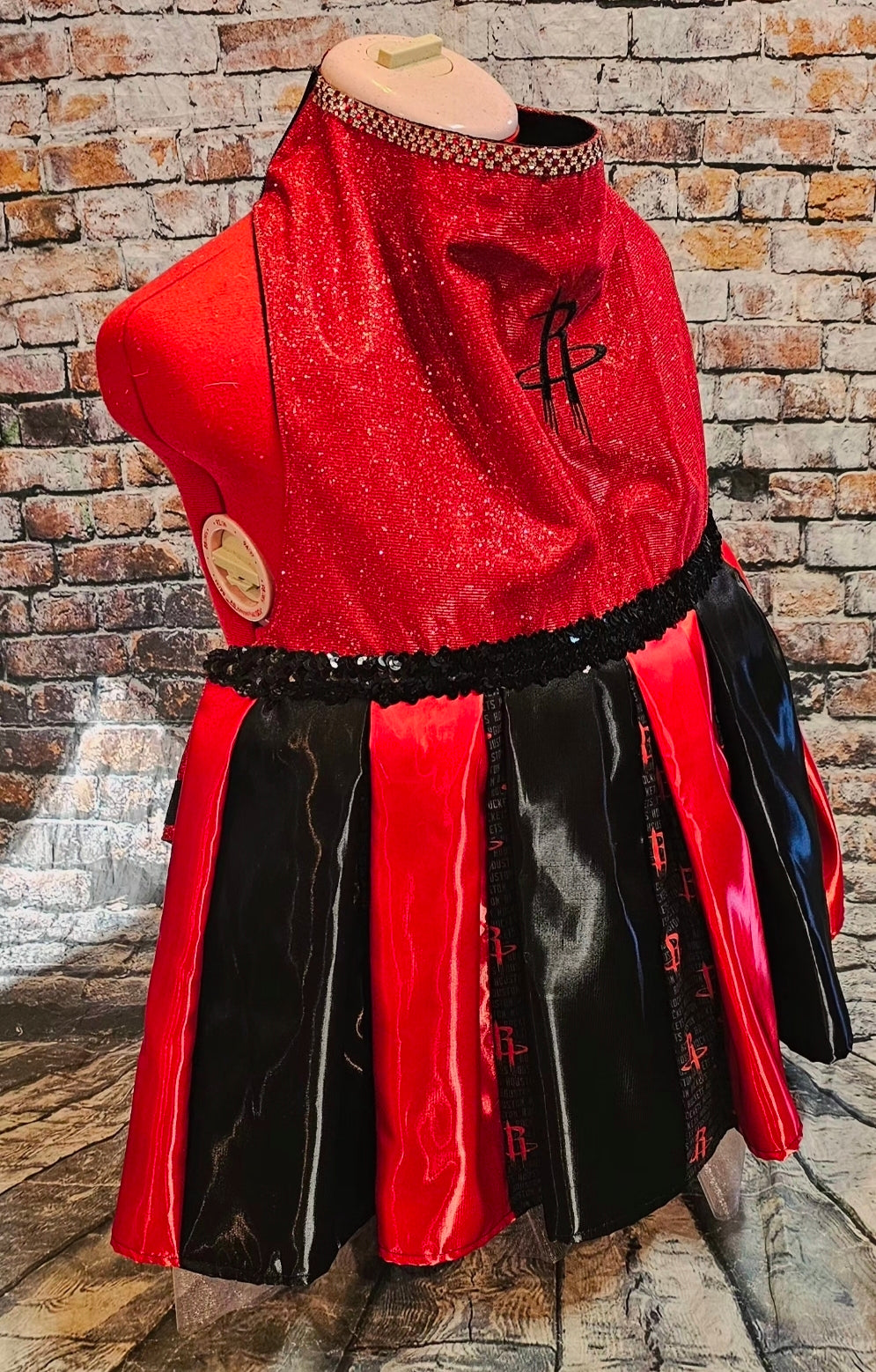 Your Houston Rockets fan will turn heads in this custom-designed pet dress, expertly crafted with premium materials. The embroidered Rockets logo adorns a shimmering metallic lurex glitter bodice available in classic black or vibrant red. The coordinating skirt features authentic Rockets cotton print fabric layered with liquid silk, accented by sequin and rhinestone trim for added glamour. A tulle underskirt provides structure and movement. Each piece is individually made, allowing for custom team requests. Perfect for game day celebrations or year-round team spirit.