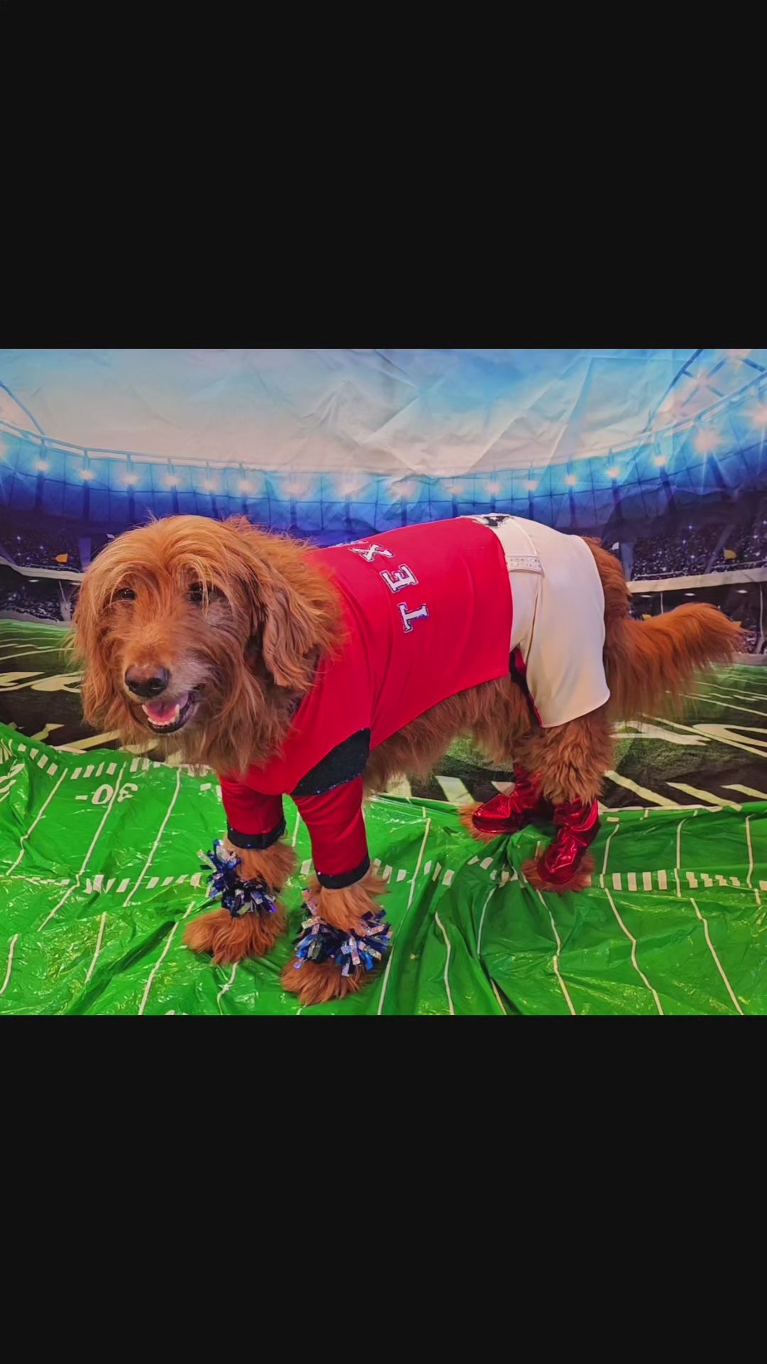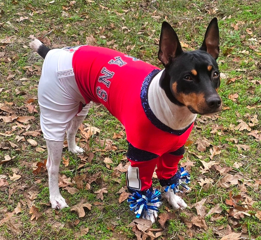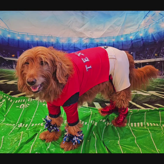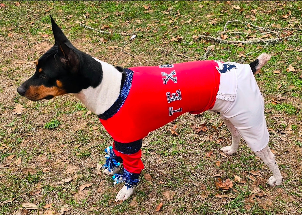Replica Houston Texan pet costume. Comes with cheerleader body suit, 2 pom pom for wrist, 2 boots.