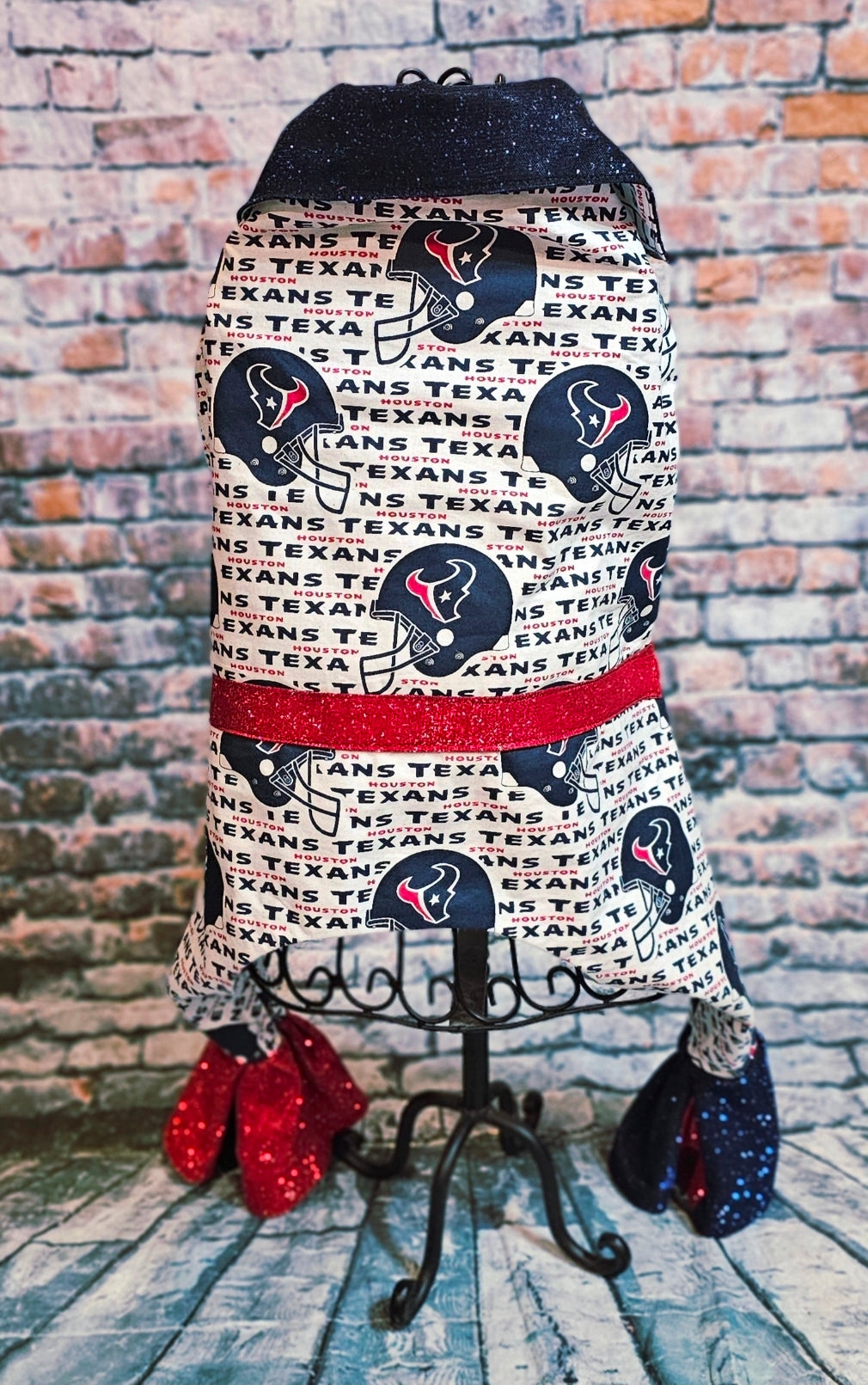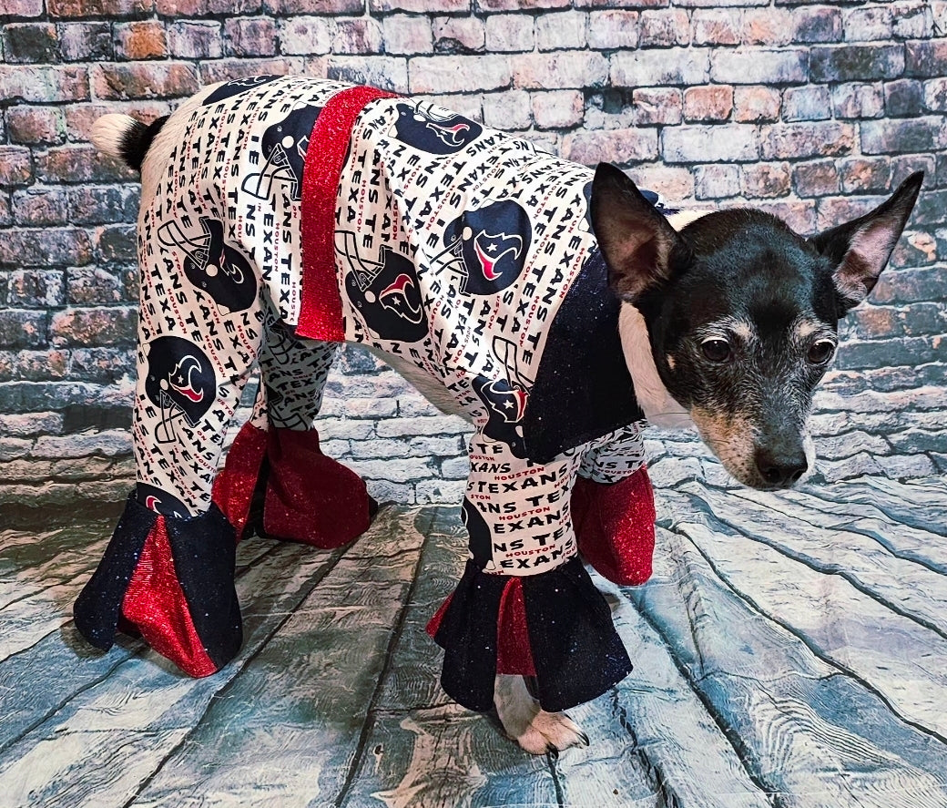 Let your pet steal the spotlight at every Texans gathering with this distinctive Elvis-inspired body suit. Crafted from authentic Houston Texans cotton print fabric, this ensemble features a glamorous glitter lurex metallic belt and flared bell-bottom legs for maximum showstopping style. Perfect for game day celebrations, team events, and fan parties where your furry companion deserves to make a memorable appearance.