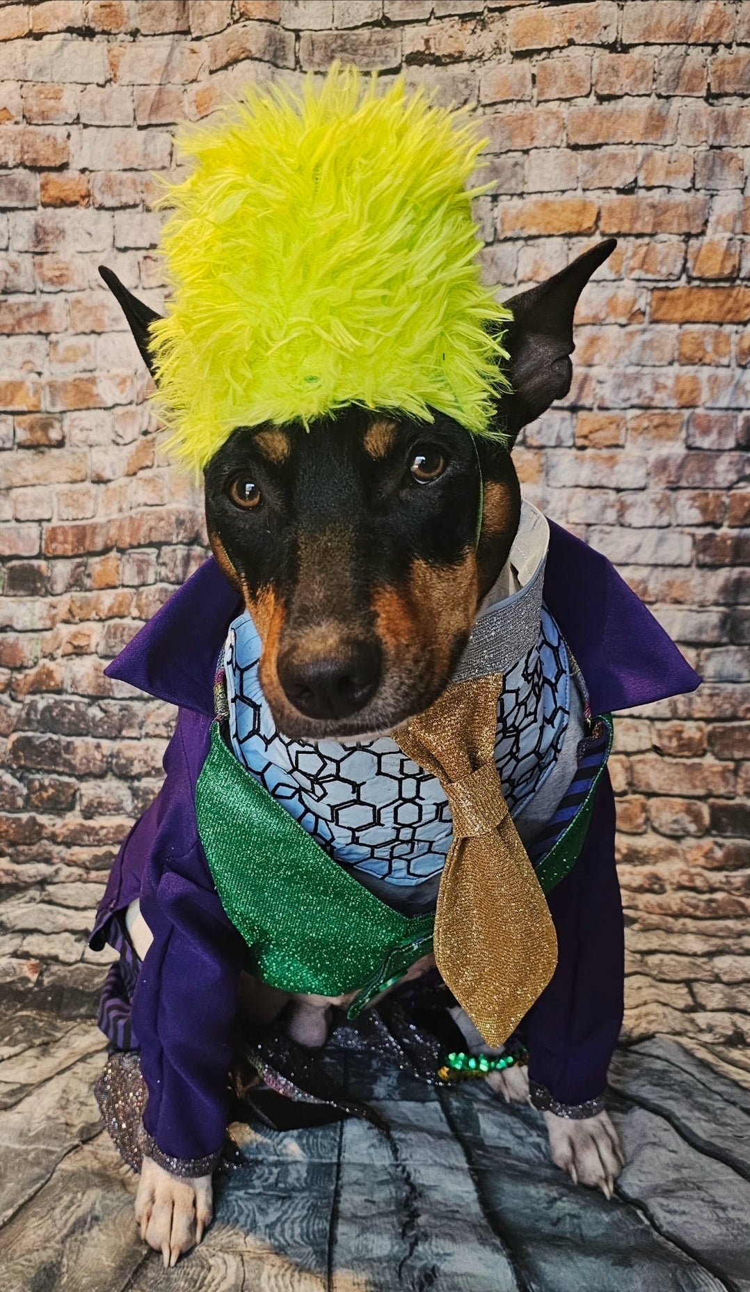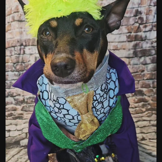 Elevate your pet’s style with this custom, one-of-a-kind Joker costume featuring sparkling accents and shimmering details. Expertly crafted to combine eye-catching shine with the iconic Joker design, this costume ensures your pet stands out at any event. Made with high-quality materials to provide comfort and durability, it perfectly balances boldness and finesse, making it an exceptional choice for those seeking a unique, dazzling look for their furry companion.