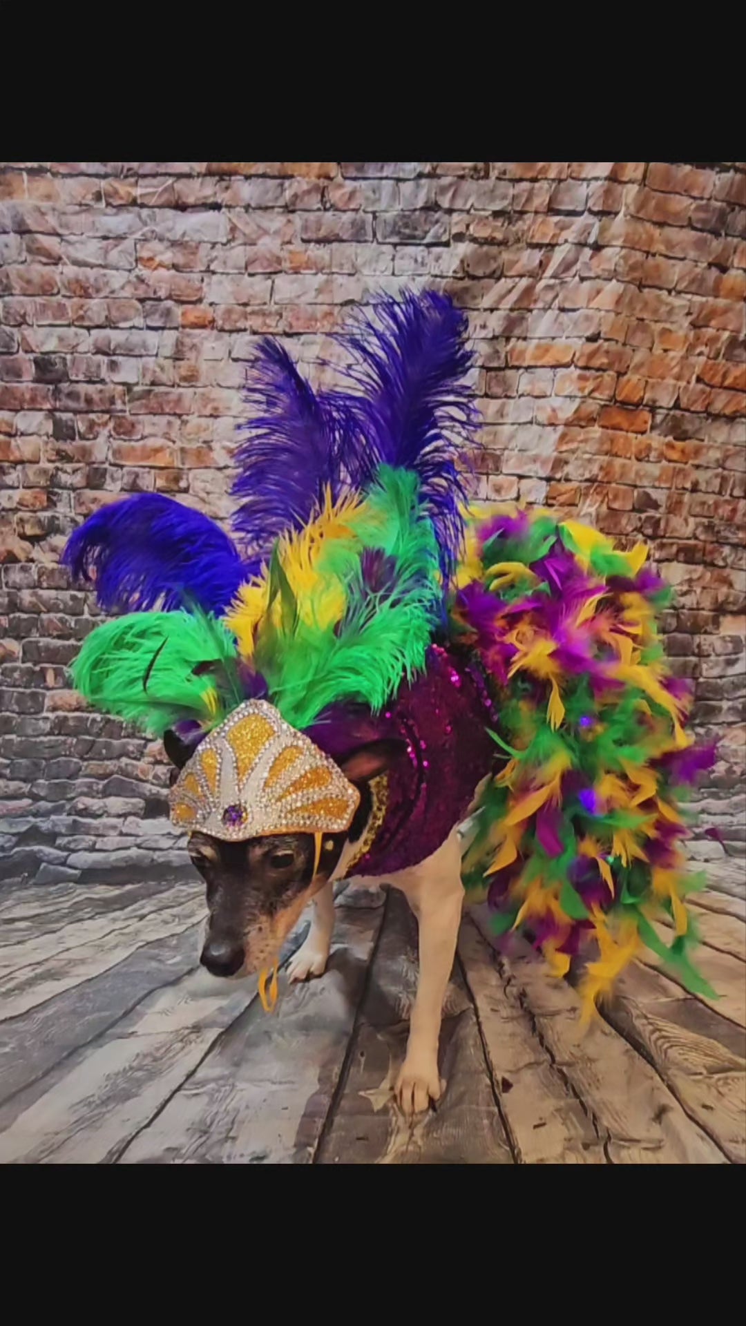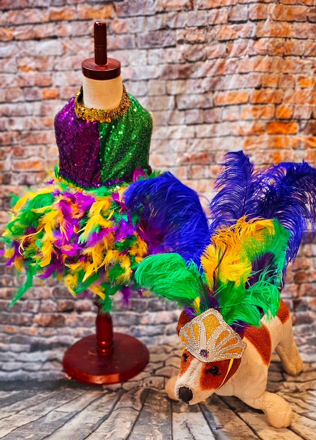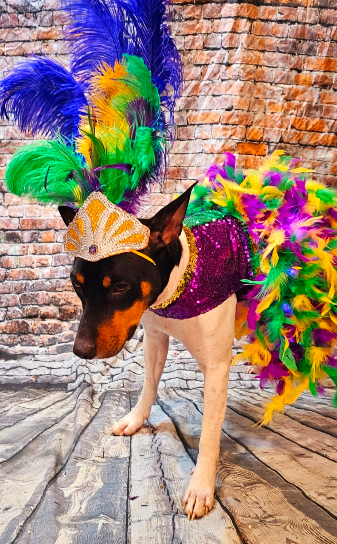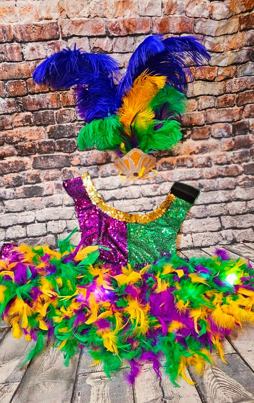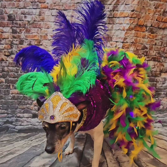 Celebrate Mardi Gras in style with this exclusive light-up pet dress inspired by the iconic showgirl look. This custom costume features a dress adorned with half purple and half green sequin bodice, gold and multicolored elastic trims, and a feathered skirt woven with LED lights powered by a discreet battery pack. Choose between a metallic gold feathered headdress or a feathered hat, both embellished with glitter vinyl, clear and Mardi Gras-colored rhinestones, and vibrant ostrich feathers. A dress-only option is also available for flexibility. Stand out and make every parade unforgettable.