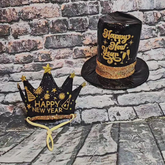 Celebrate the upcoming new year with your pet in distinguished style. Select between two sophisticated headwear options—an elegant crown or classic top hat—each designed to make your companion the star of your NYE festivities. Both styles deliver refined holiday glamour for pets who deserve to mark the occasion in memorable fashion. Perfect for photos, parties, and creating lasting memories as you welcome the new year together.