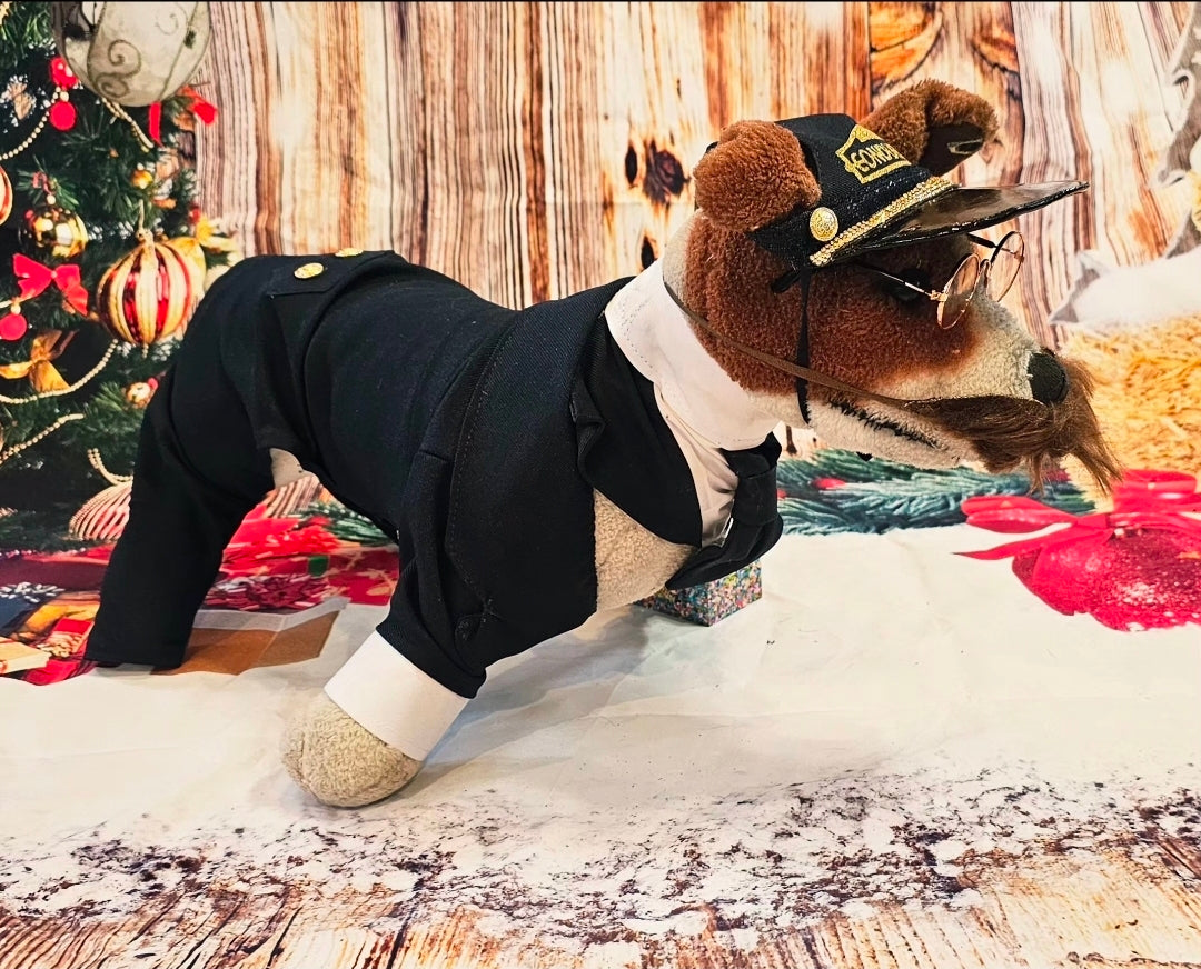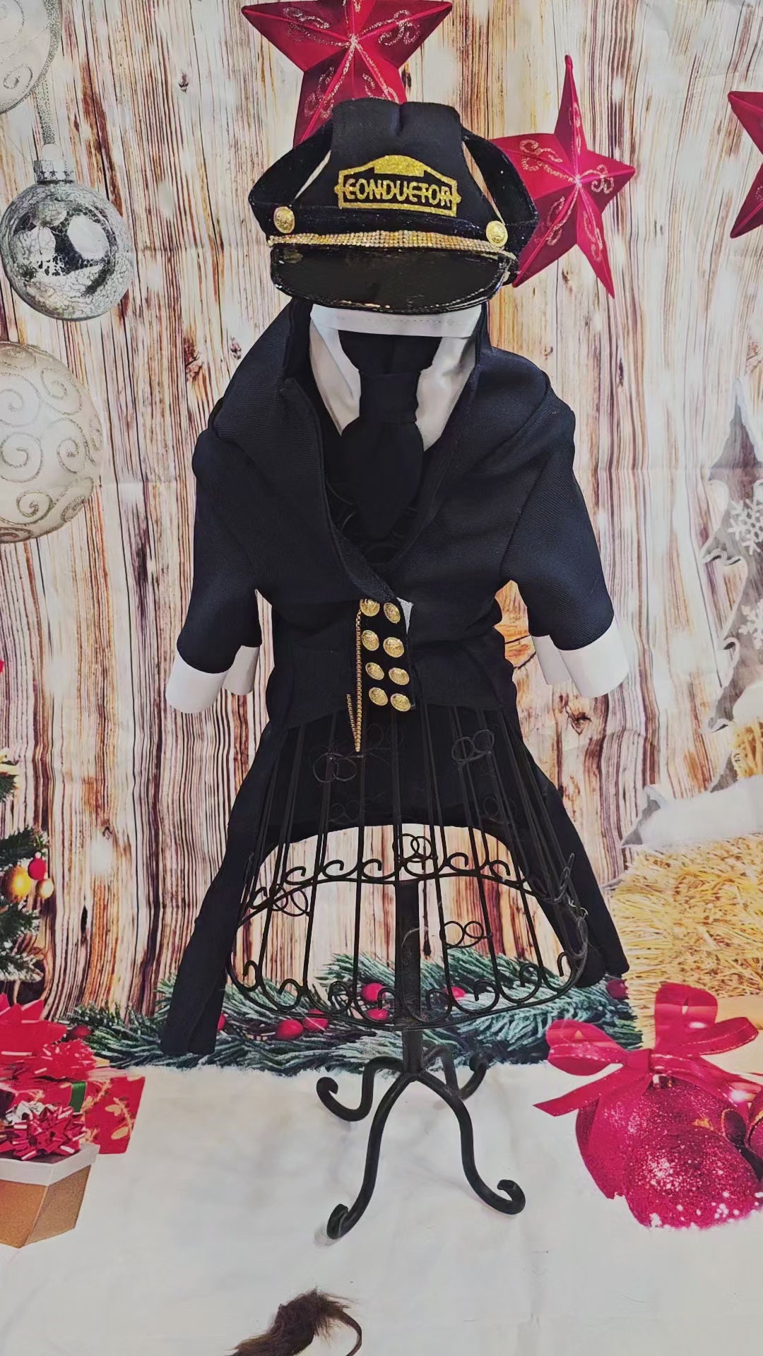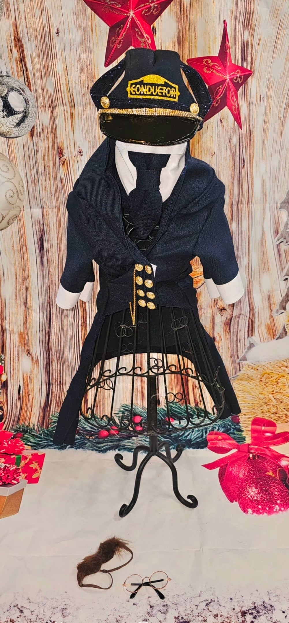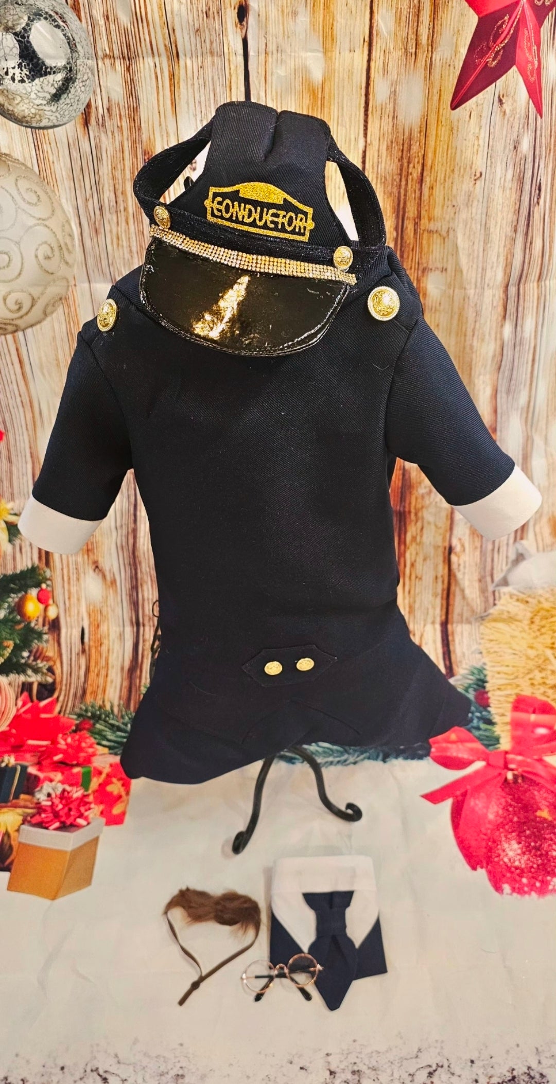Transform your pet into the iconic conductor from the beloved holiday classic with this comprehensive costume ensemble. Featuring authentic details including a navy gabardine suit adorned with gleaming gold buttons, a sophisticated tuxedo tie bandanna, an official conductor's hat, vintage-style glasses, and a luxurious brown faux fur beard, this costume delivers complete character authenticity. Perfect for holiday photos, festive gatherings, or capturing that magical Polar Express spirit with your furry companion.