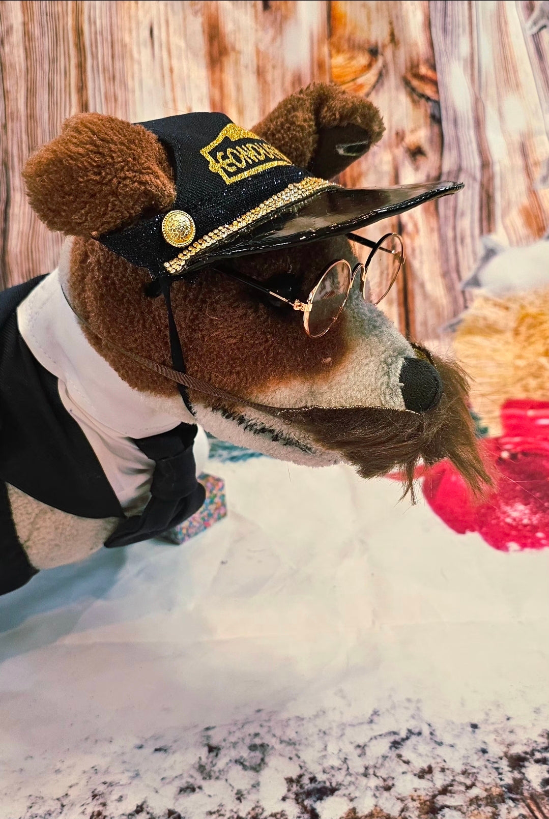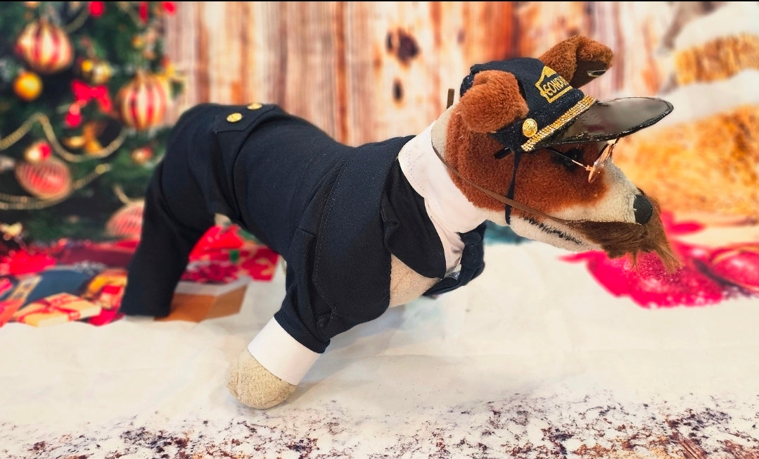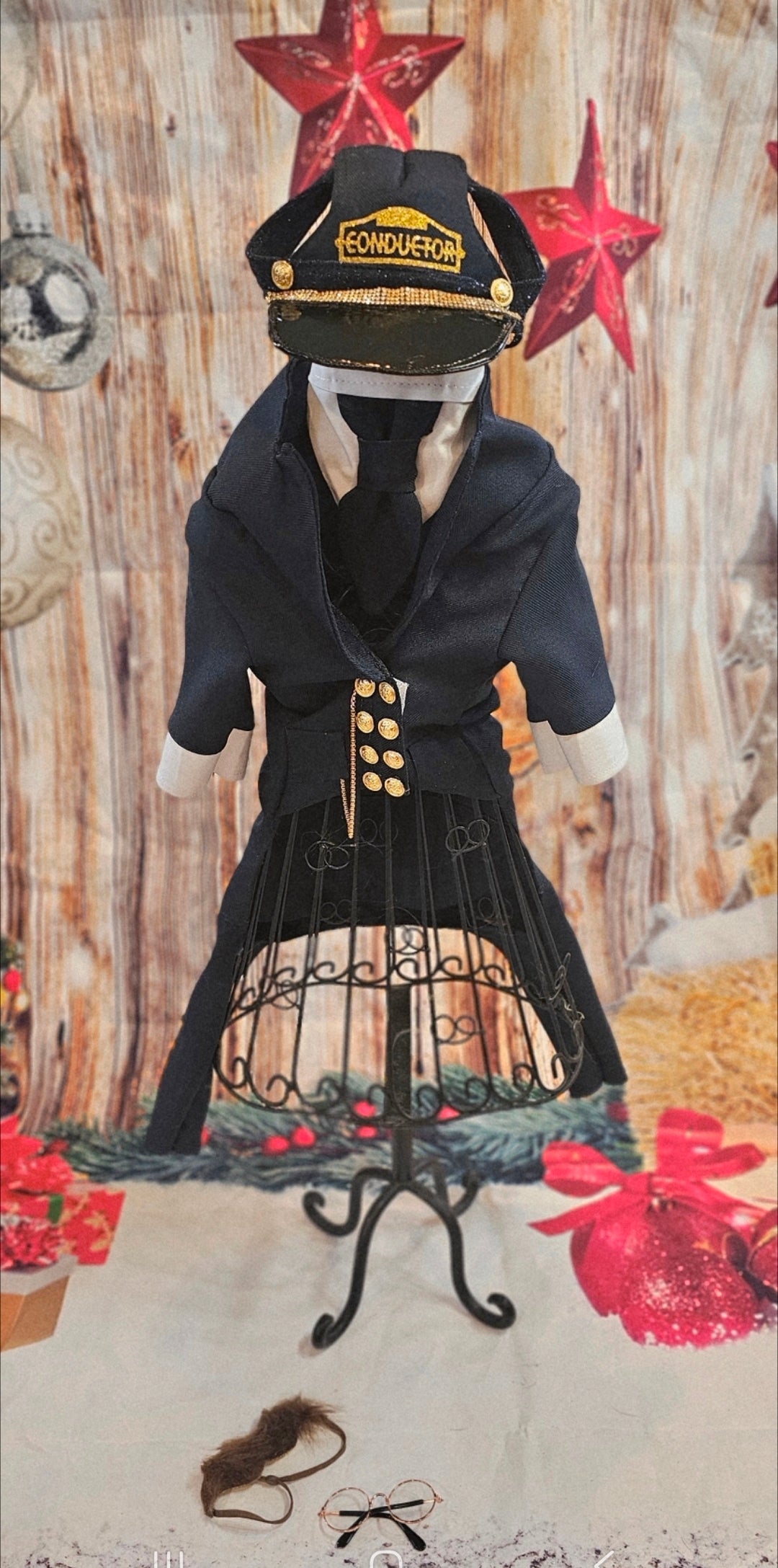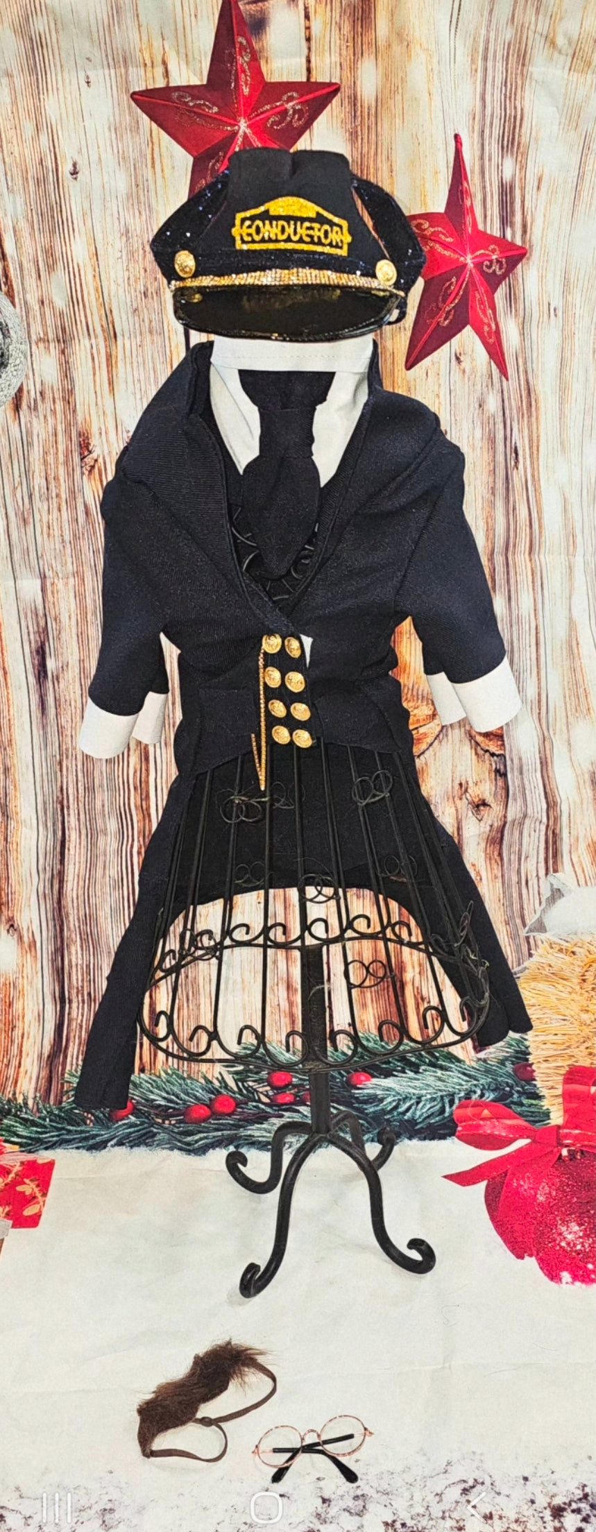 Transform your pet into the iconic conductor from the beloved holiday classic with this comprehensive costume ensemble. Featuring authentic details including a navy gabardine suit adorned with gleaming gold buttons, a sophisticated tuxedo tie bandanna, an official conductor's hat, vintage-style glasses, and a luxurious brown faux fur beard, this costume delivers complete character authenticity. Perfect for holiday photos, festive gatherings, or capturing that magical Polar Express spirit with your furry companion.