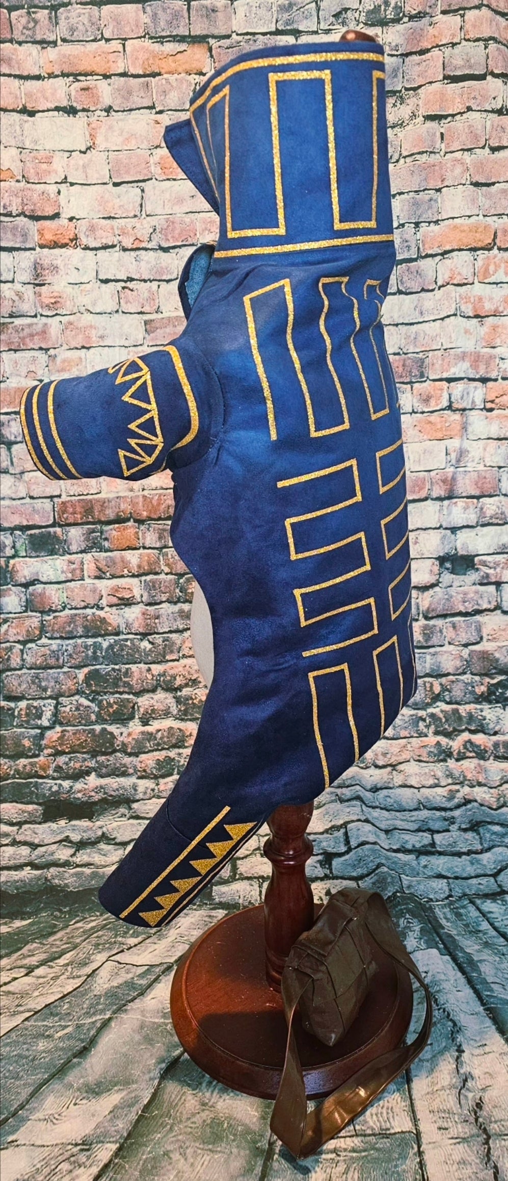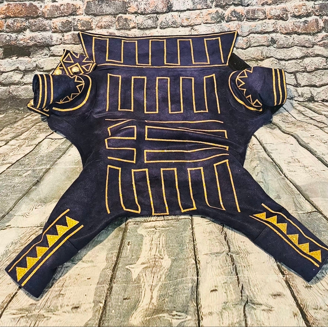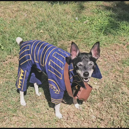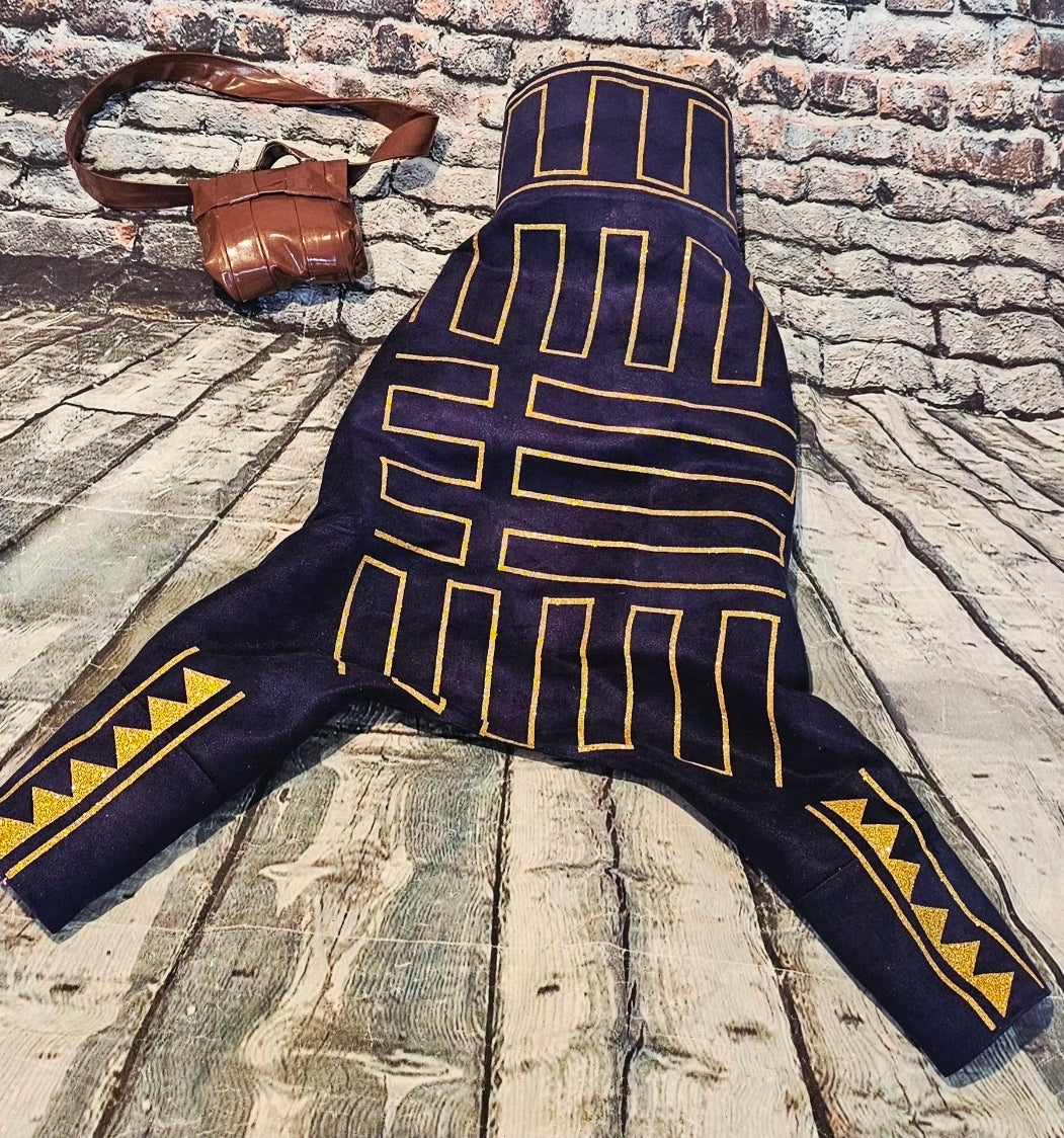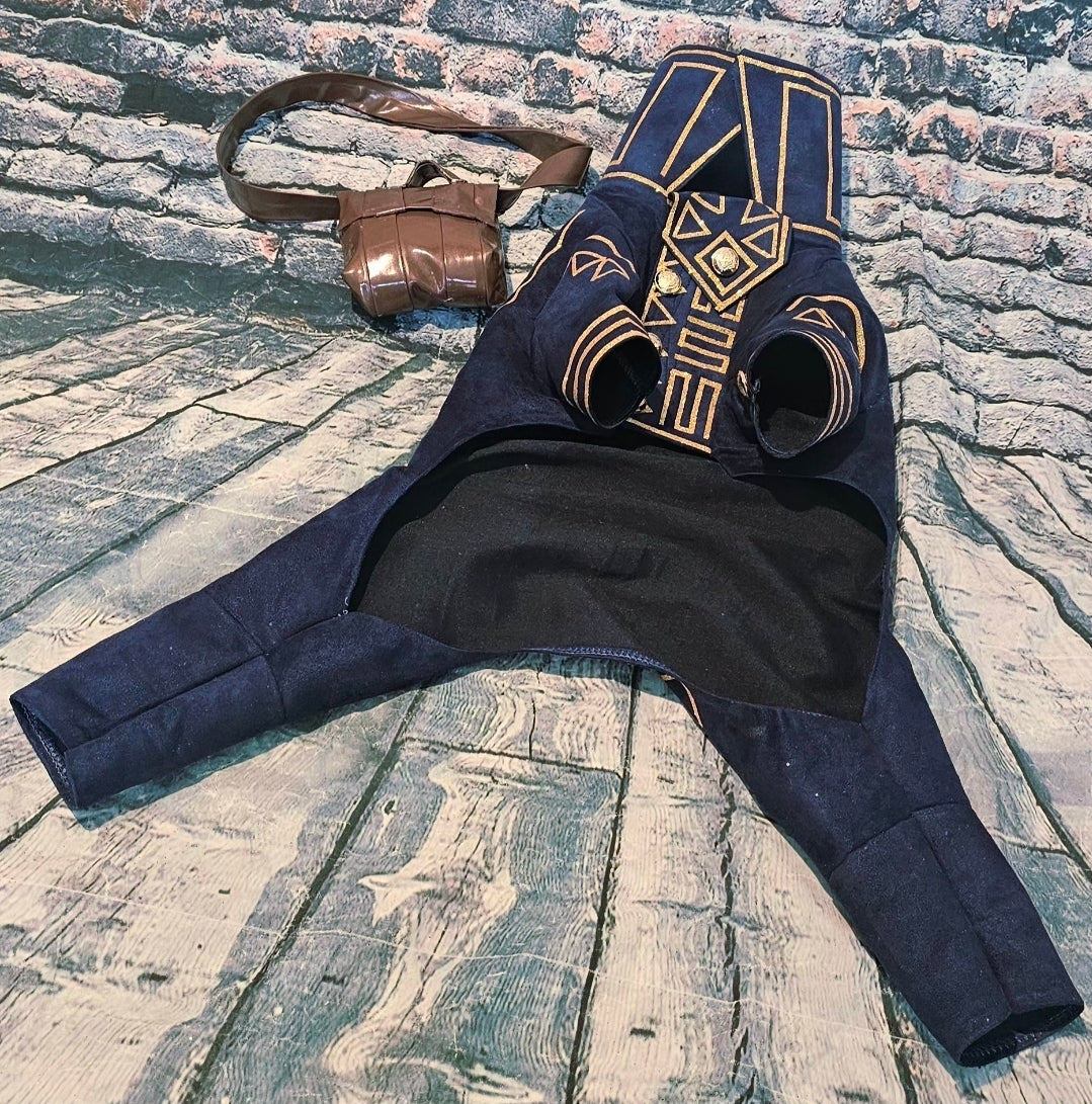Prince Fiyero, a character recognized for his complex romantic story in Wicked, appears here as a pet costume. This custom-designed outfit features a full body suit and a messenger bag. Crafted from microsuede fabric, it includes glitter vinyl detailing and a faux leather messenger bag, replicating the prince’s distinctive look before his transformation into a scarecrow.