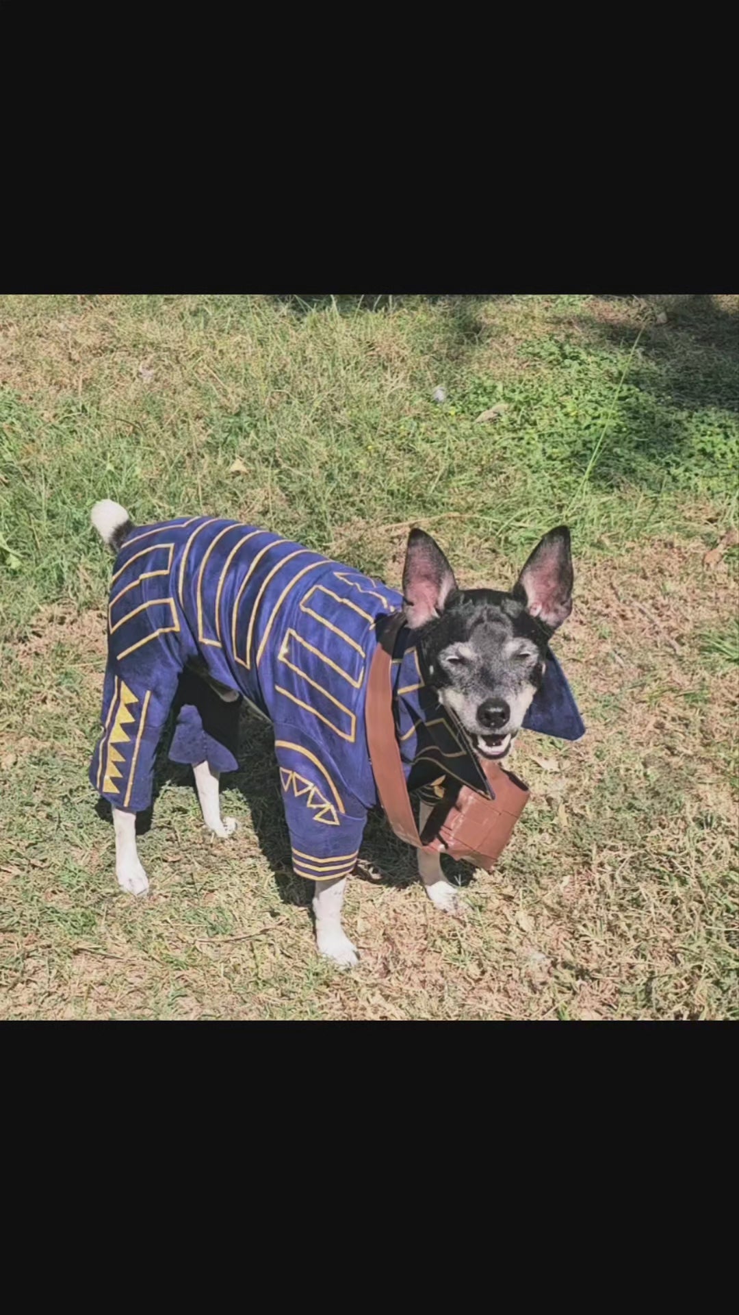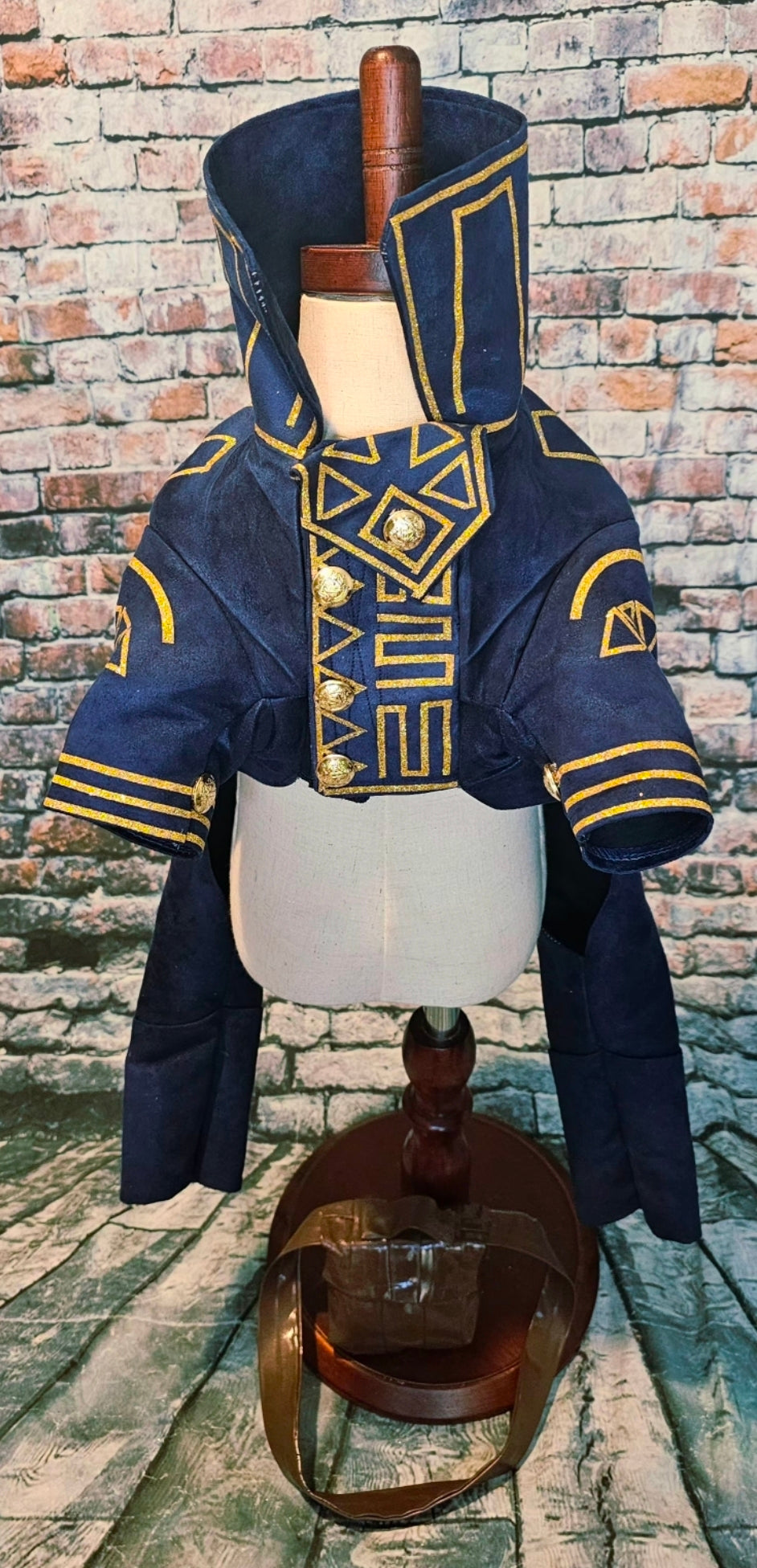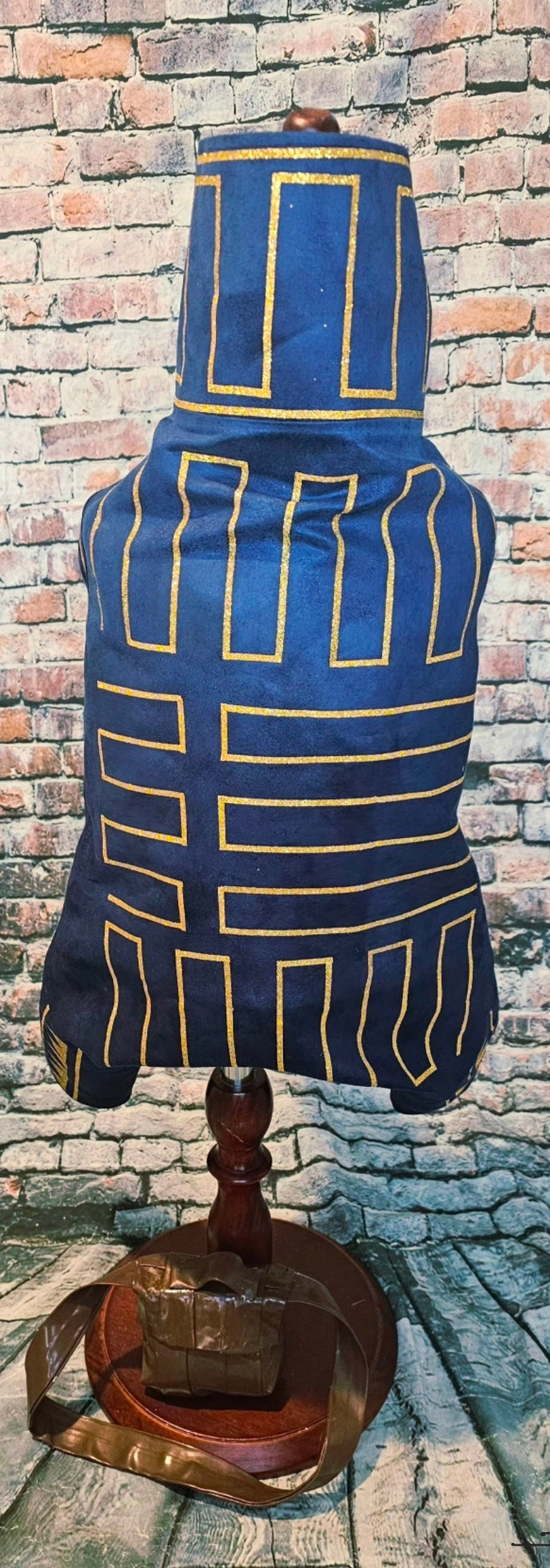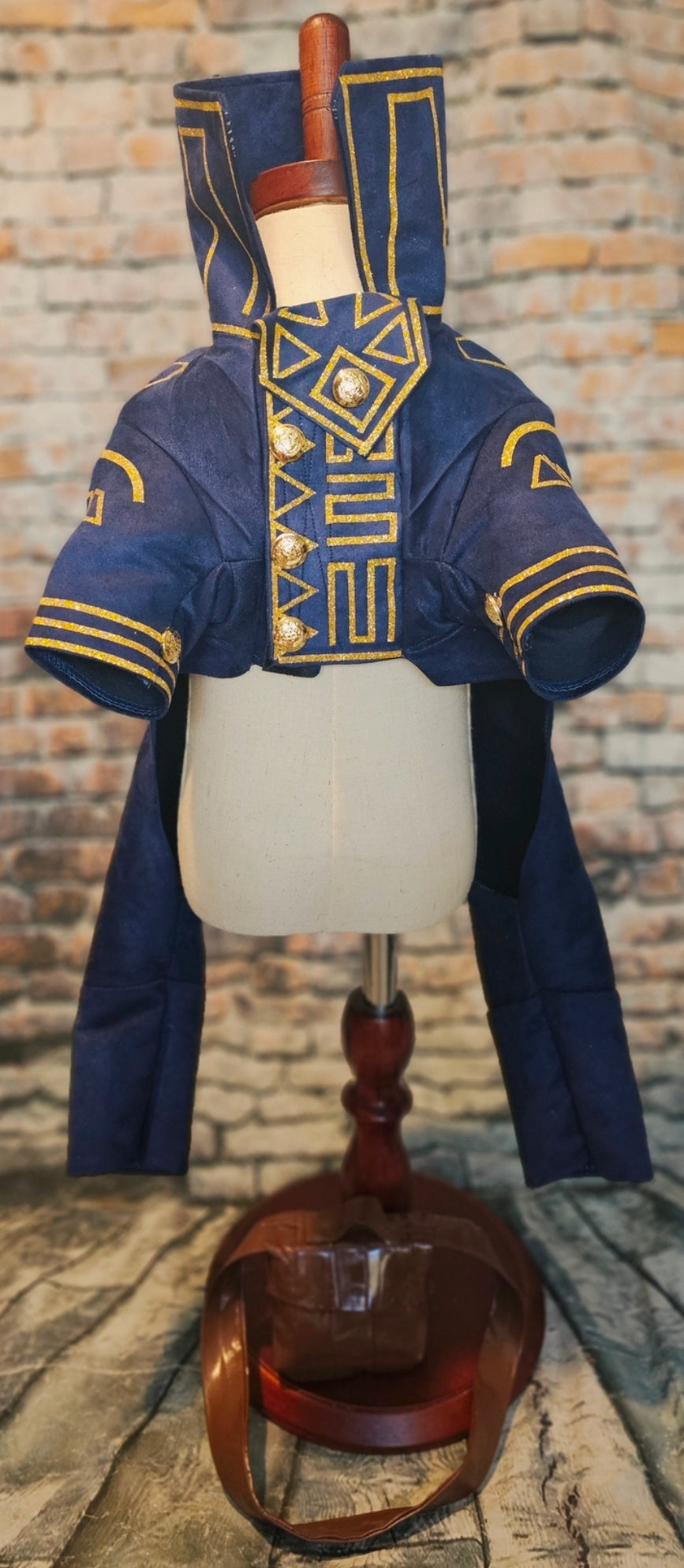 Prince Fiyero, a character recognized for his complex romantic story in Wicked, appears here as a pet costume. This custom-designed outfit features a full body suit and a messenger bag. Crafted from microsuede fabric, it includes glitter vinyl detailing and a faux leather messenger bag, replicating the prince’s distinctive look before his transformation into a scarecrow.