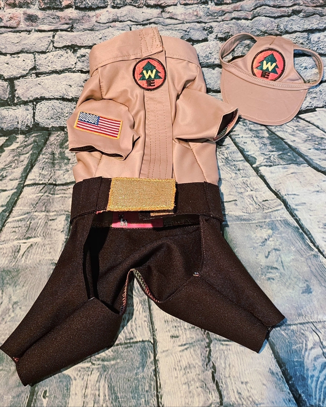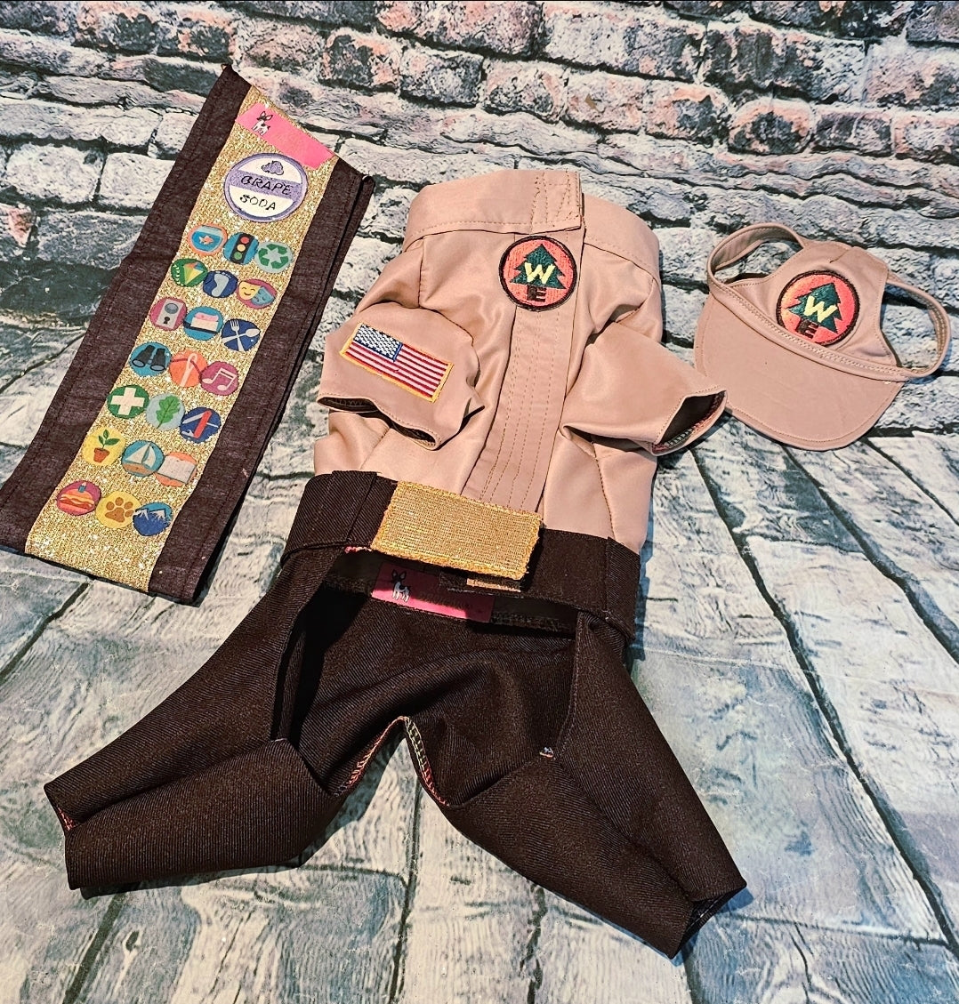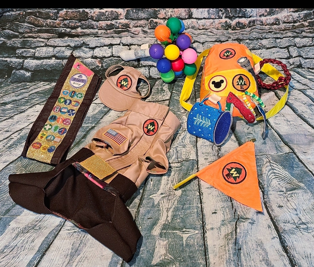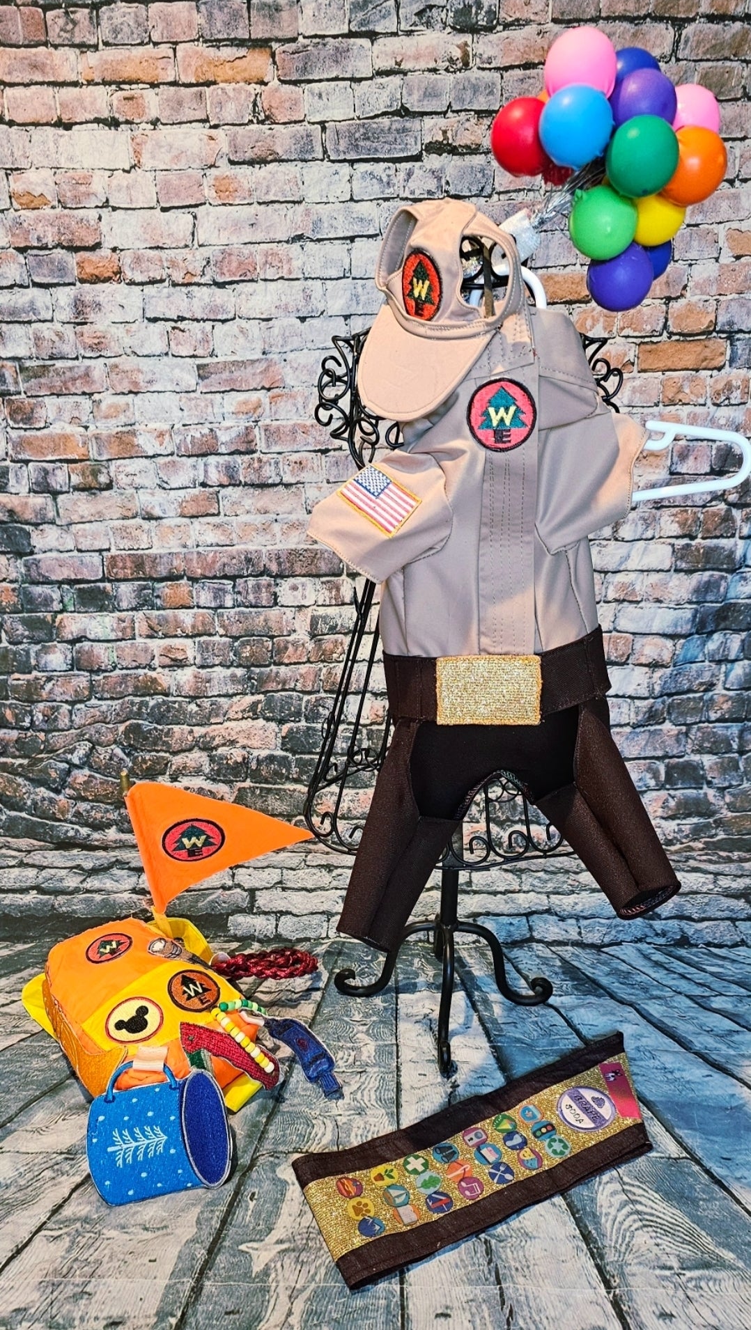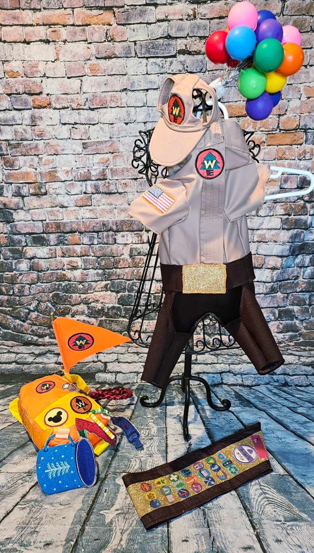 Costume includes body suit uniform, backpack with embroidered patches, flag with embroidered patch, hat with embroidered patch, honor badge slash, faux balloons for pet wrist.