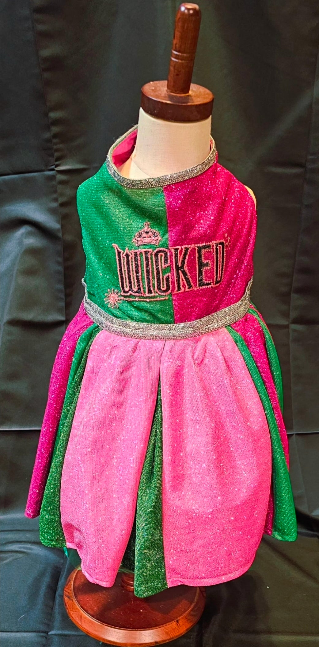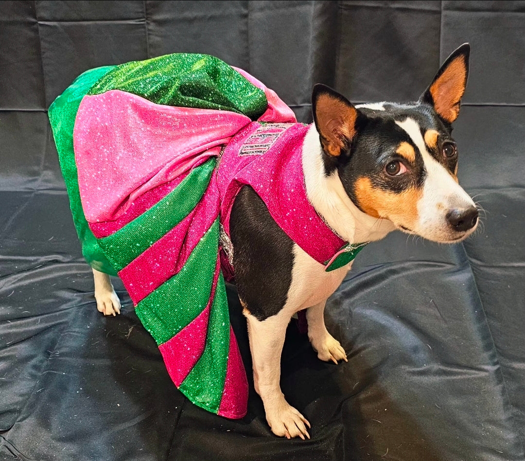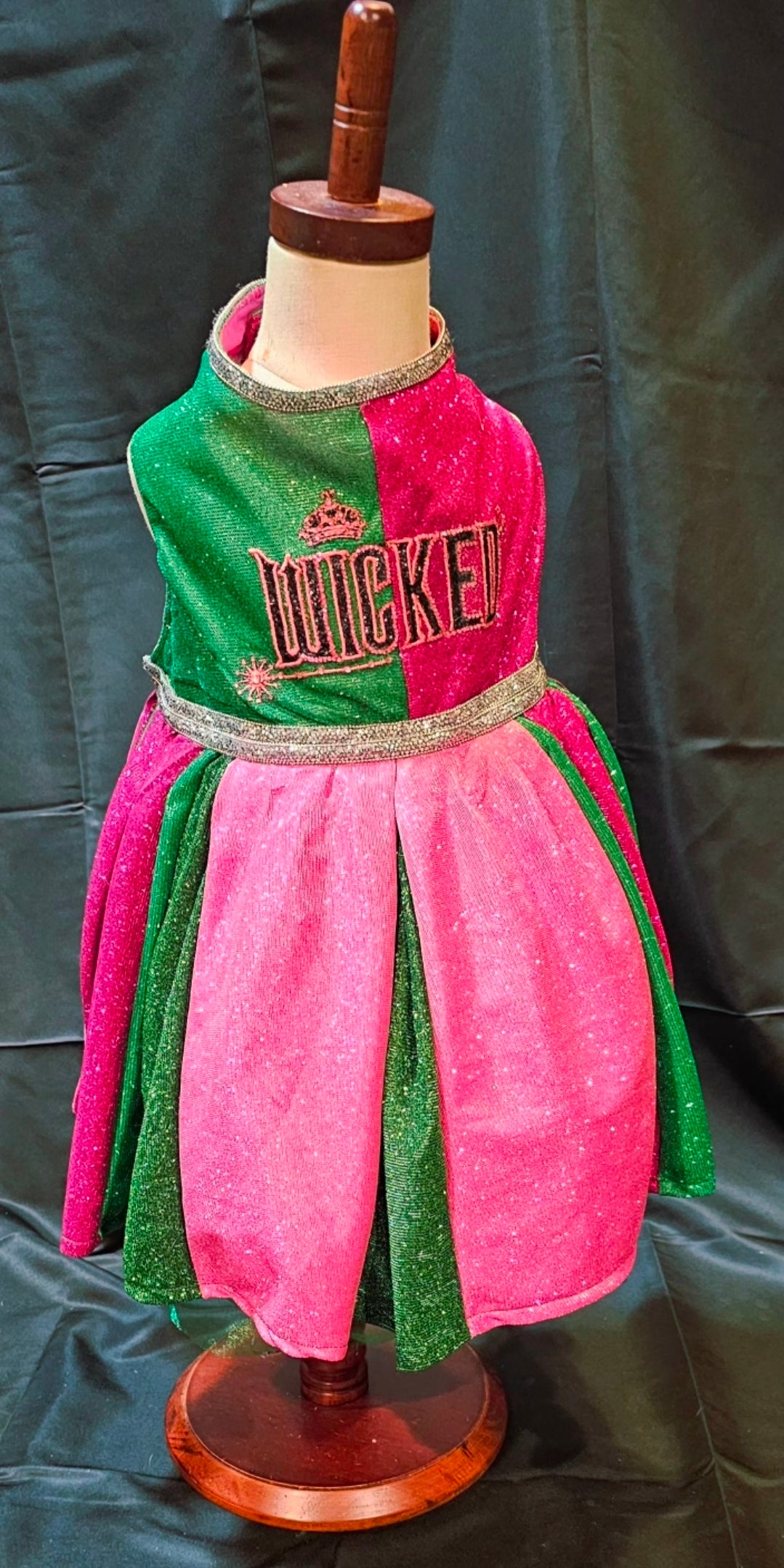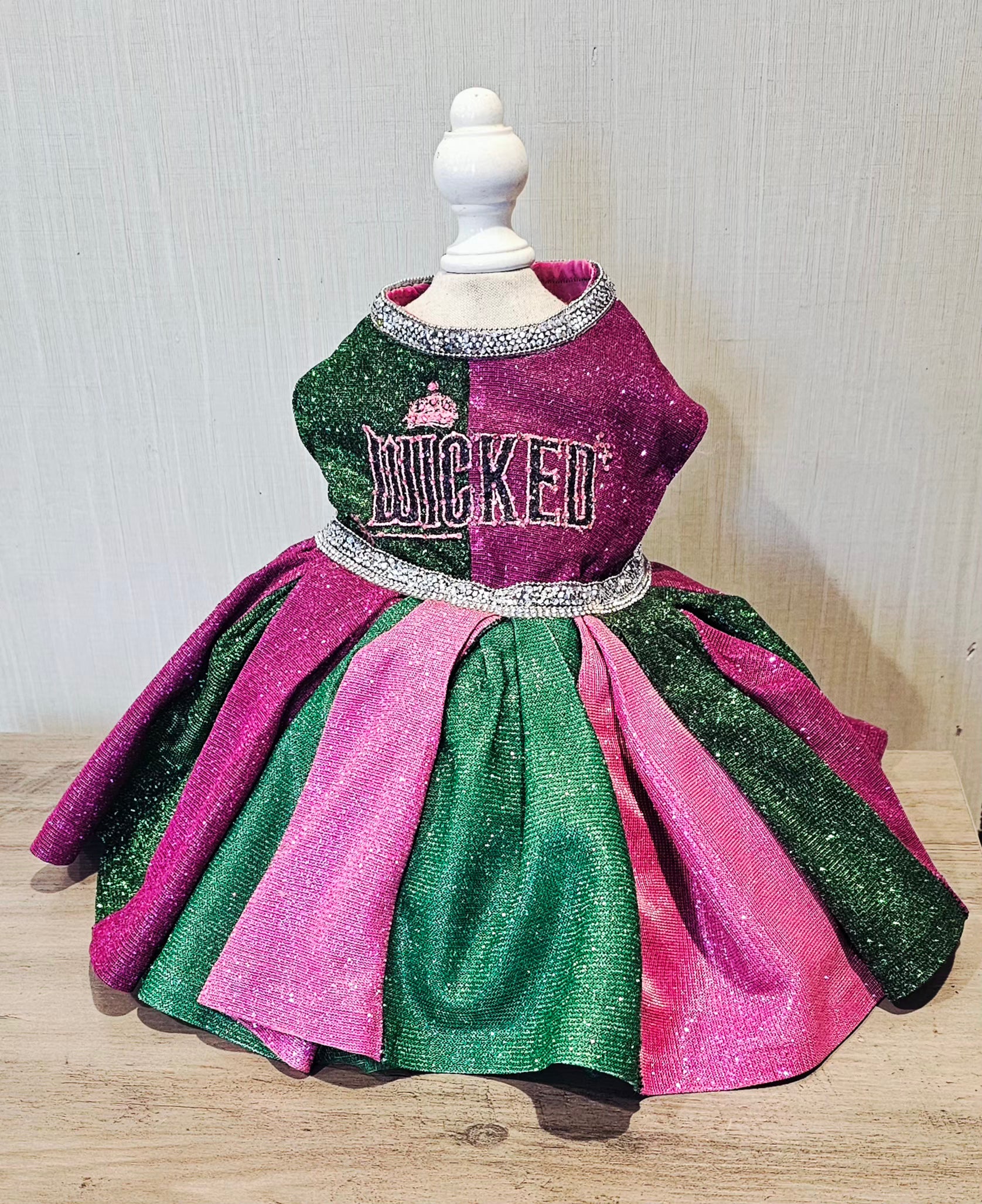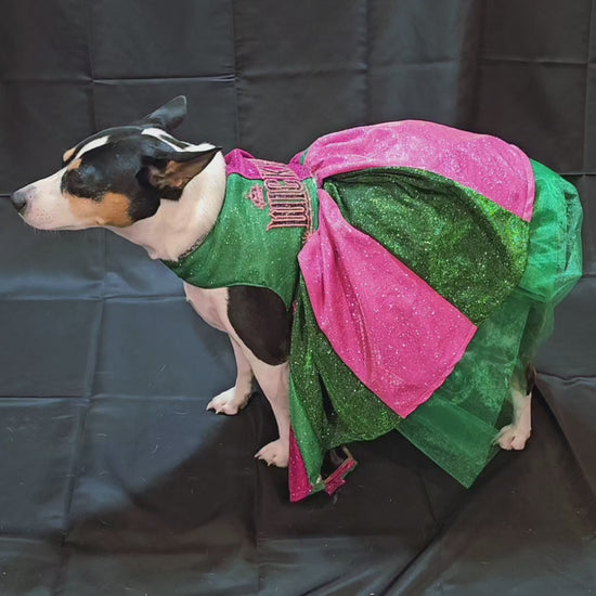Let your furry friend steal the spotlight in this enchanting pet dress inspired by the beloved Wicked universe. Crafted from luxurious pink and green metallic glitter lurex, this showstopping piece features intricate embroidery across the bodice, elegant rhinestone accents, and a voluminous tulle underskirt for added dimension. Whether your pet pledges allegiance to Glinda or Elphaba, this one-of-a-kind creation delivers red-carpet glamour with every wear. Perfect for devoted fans who want to share their passion with their beloved companion.