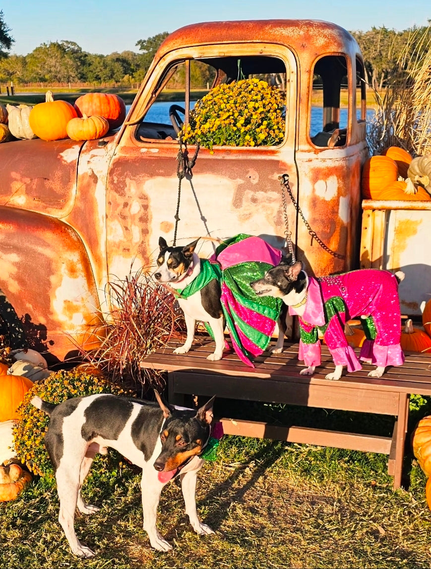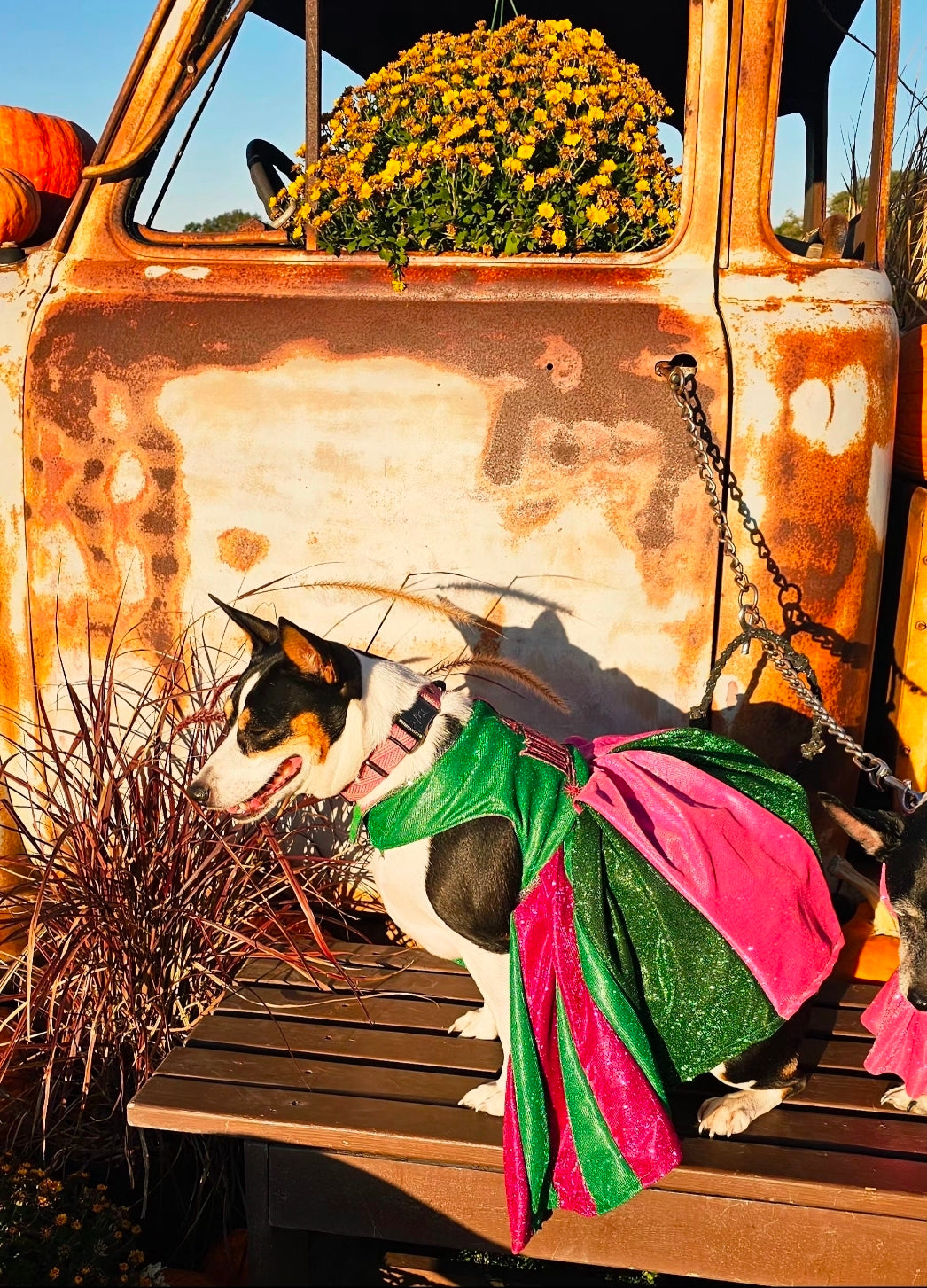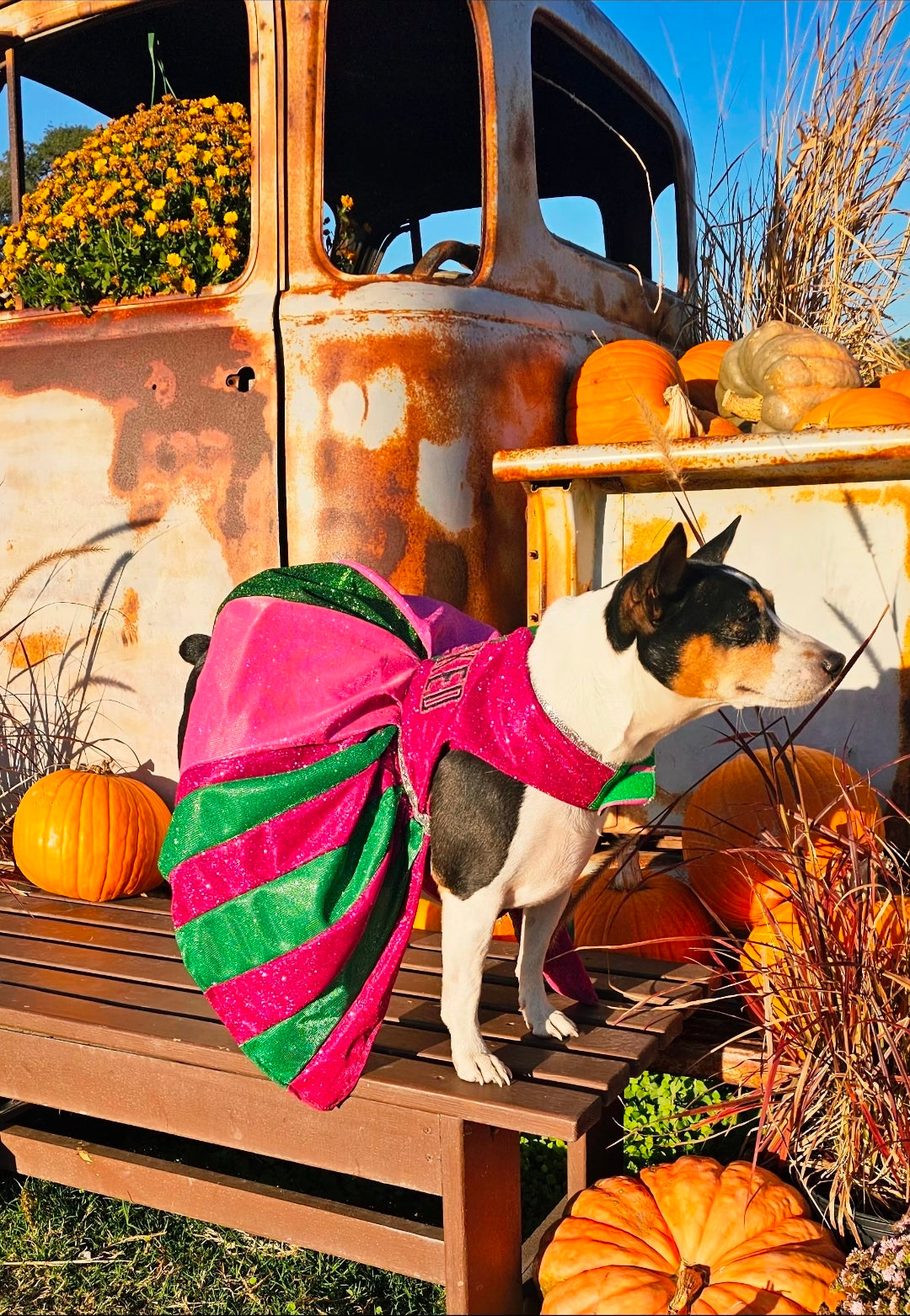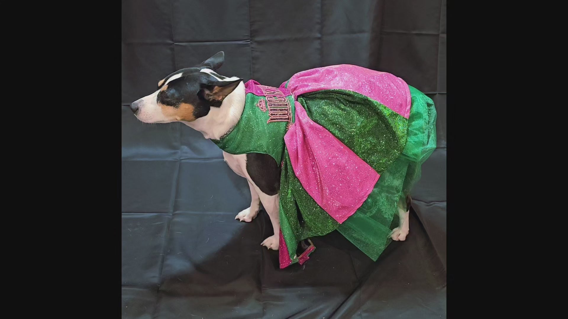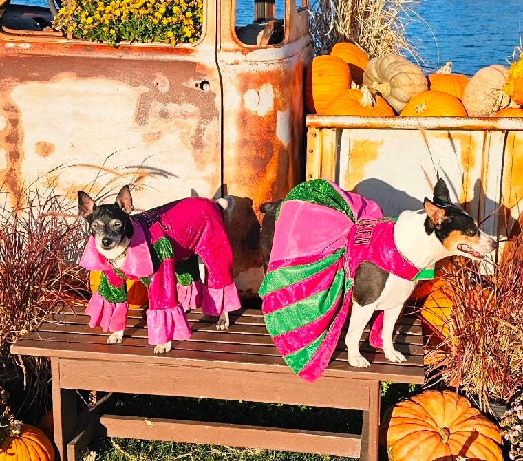Let your furry friend steal the spotlight in this enchanting pet dress inspired by the beloved Wicked universe. Crafted from luxurious pink and green metallic glitter lurex, this showstopping piece features intricate embroidery across the bodice, elegant rhinestone accents, and a voluminous tulle underskirt for added dimension. Whether your pet pledges allegiance to Glinda or Elphaba, this one-of-a-kind creation delivers red-carpet glamour with every wear. Perfect for devoted fans who want to share their passion with their beloved companion.