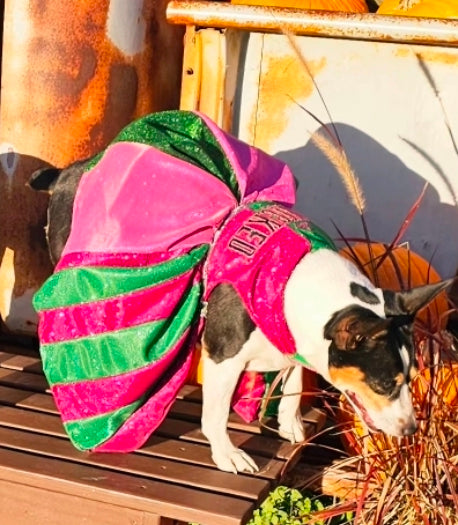 Wicked glitter embroidered pet dress, pink and green wicked pet dress